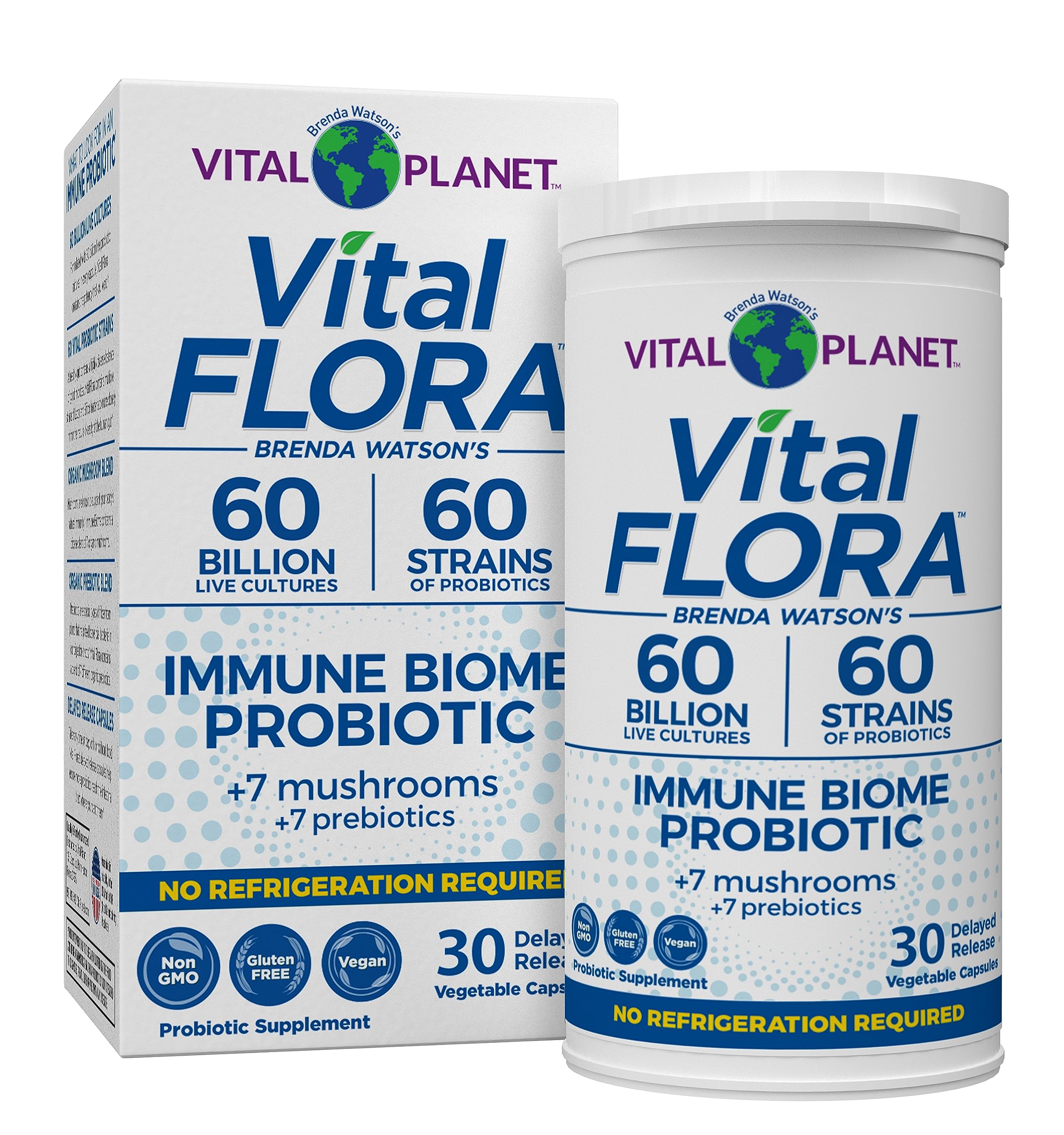 Quality, Purity and Potency Standards - Vegan, non-GMO, dairy free, soy free gluten free. Made with safe clean ingredients with no unnatural binders, fillers, or artificial ingredients. We formulate to meet or exceed labeled potency through expiration and third-party certify our products for purity potency. Shelf stable – no refrigeration required. Expertly Formulated - Vital Planet founder Brenda Watson and her team of digestive care experts and scientists have been successfully formulating high potency, highly diverse probiotics for decades using the latest microbiome research discoveries to guide them. To help ensure the probiotics reach the intestinal tract where you want them, we use delayed release vegetable capsules specially designed to resist stomach acid. Plus Prebiotics and Functional Mushrooms - Prebiotics like plant-based fibers and mushrooms help feed good probiotics in the gut. Certain functional mushrooms are also known to enhance our natural immune responses. Because we believe diversity is important for comprehensive health benefits, Immune Biome contains 7 different organic whole food prebiotics and 7 carefully-selected organic functional mushrooms. Diversity Matters - A healthy gut contains a highly diverse balance of good probiotics. To more closely match this natural diversity, Vital Flora probiotics contain 60 different Lacto and Bifido strains. Our Immune Biome formula contains a higher ratio of Lactobacillus known for its powerful role in supporting a healthy immune response. A healthy gut naturally contains high concentrations of lactobacillus in the small intestines where most of our immune system resides. Premium Immune Probiotic for Adults - Vital Flora Immune Biome Probiotic is a high quality, potent one-capsule-a-day formula with 60 Billion live cultures (CFU) from 60 beneficial, clinically-studied Bifido and Lacto strains plus 7 organic prebiotics 7 organic functional mushrooms. Our optimally balanced, complete daily probiotic supports healthy immune function and gut microbiome health, plus it promotes regularity and helps reduce occasional digestive discomforts.