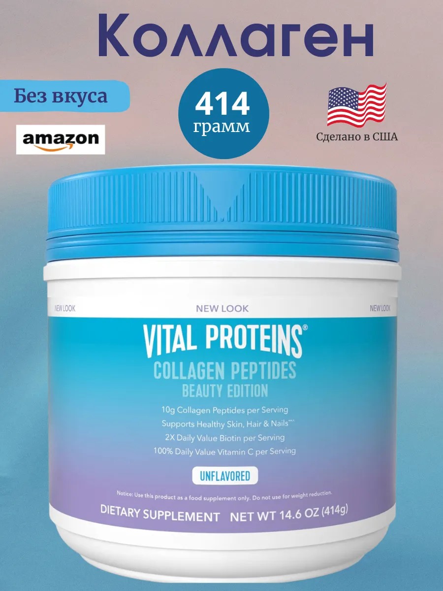 Vital Proteins Collagen Peptides Beauty Edition — это коллагеновый комплекс в порошковой форме для поддержки здоровья кожи, волос и ногтей. Каждая порция (10,6 г) содержит 10 г гидролизованных коллагеновых пептидов из шкур крупного рогатого скота, выращенного на пастбищах, а также 30 мкг биотина, 100% дневной нормы витамина C и 2 мг цинка для антиоксидантной защиты и укрепления структуры. Продукт не имеет вкуса, легко растворяется в горячих или холодных напитках и разработан для ежедневного ухода за красотой. Не содержит ГМО, глютен, молочные продукты, искусственные ароматизаторы или консерванты, сертифицирован по стандартам GMP.