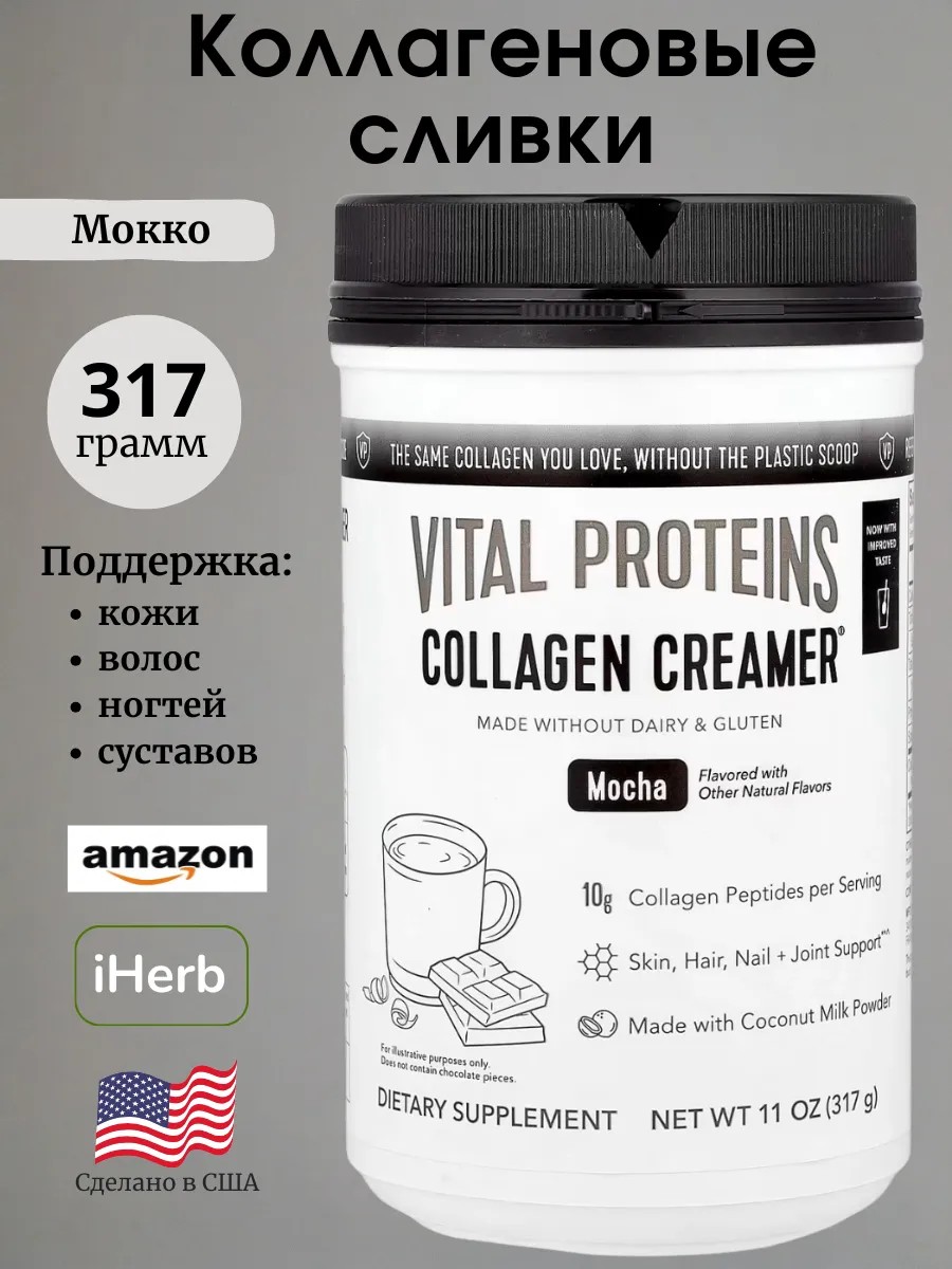 Collagen Creamer со вкусом мокко от Vital Proteins — это функциональная добавка, предназначенная для поддержки здоровья кожи, волос, ногтей, суставов и костей. Продукт содержит 10 г гидролизованных пептидов коллагена на порцию, полученных из коров, выращенных на пастбищах. Также в составе присутствует органический порошок кокосового молока, обеспечивающий источник полезных жиров. Продукт не содержит молочных продуктов, глютена и ГМО.