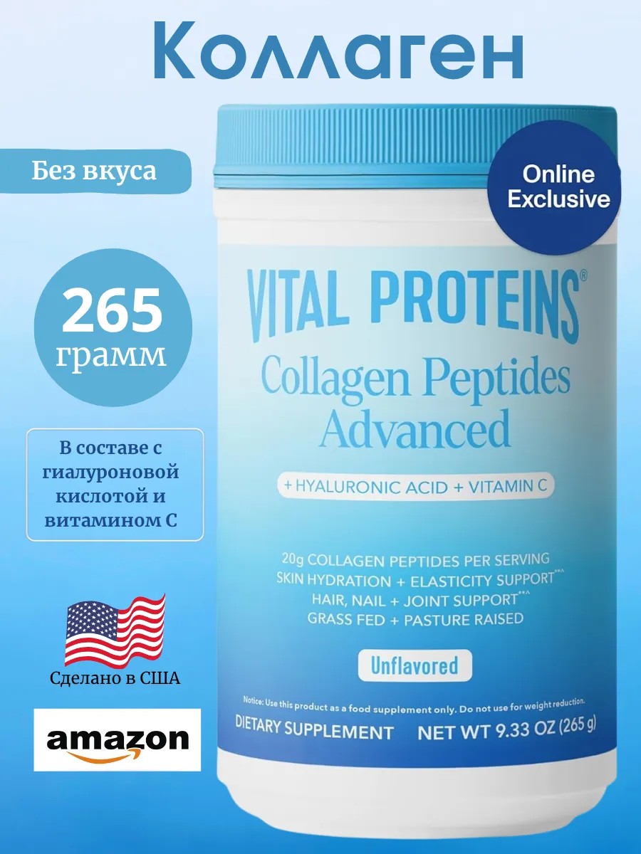Collagen Peptides Advanced — это обновлённая формула от Vital Proteins с акцентом на здоровье кожи, суставов и общего тонуса организма. Содержит 20 г гидролизованного коллагена на порцию, обогащена гиалуроновой кислотой и витамином C, что делает её особенно эффективной для увлажнения и поддержания молодости кожи.