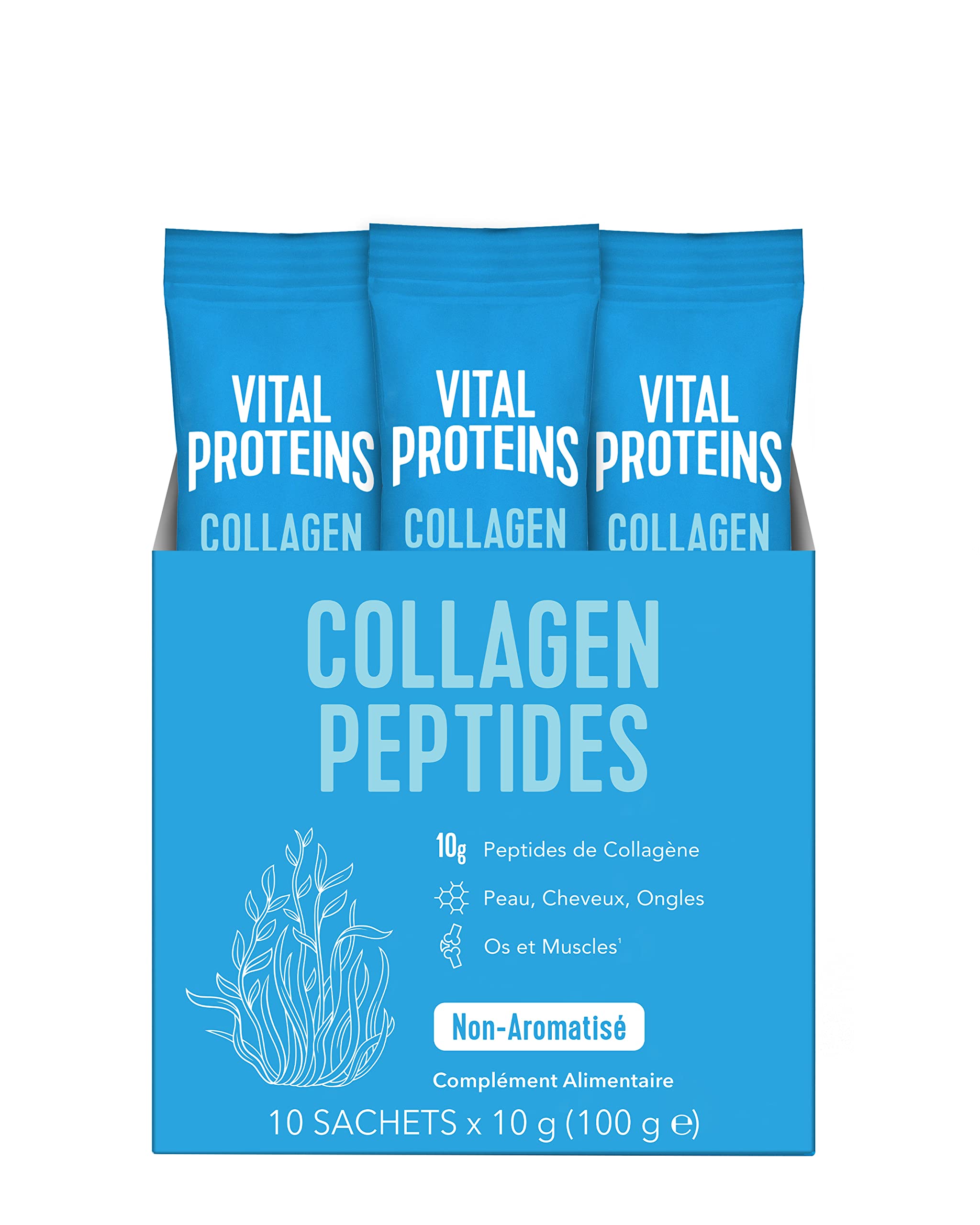 Bioavailability: Carefully selected high-quality ingredients: highly bioavailable collagen peptides for maximum effectiveness. Concentration: Formulas based on clinical studies to provide you with the right dose of collagen: 10g of collagen per sachet. Additive-free: Vital Proteins Collagen Powder contains no preservatives, artificial flavors, or colors. Our collagen peptides are naturally gluten-free and sugar-free. Collagen Peptides sticks contain a single ingredient: 100 collagen peptides!. Convenience: Take your collagen everywhere with Vital Proteins Collagen Peptides sachets. 10g of collagen powder per stick to accompany you everywhere, all the time! Perfect for easily integrating into your routine. Effectiveness: Visible benefits on skin, hair, and nails. Vital Proteins Collagen Peptides, as proteins, also contribute to the maintenance of strength and muscle mass. Collagen is a protein. Proteins contribute to the maintenance of normal bones and the increase of muscle mass.Biodisponibilité : Des ingrédients de haute qualité séléctionnés avec soin : des peptides de collagène hautement biodisponibles pour un maximum d'efficacité. Concentration : Des formules basées sur des études cliniques afin de vous fournir la bonne dose de collagène : 10g de collagène par sachet. Sans additif : La poudre de collagène Vital Proteins ne contient ni conservateur, ni arôme artificiel, ni colorant. Nos peptides de collagène sont naturellement sans gluten et sans sucres. Les sticks de Collagen Peptides contiennent un seul ingrédient : 100 peptides de collagène !. Praticité : Emportez votre collagène partout grâce aux sachets de Vital Proteins Collagen Peptides. 10g de poudre de collagène par stick pour vous accompagner partout, tout le temps ! Parfait pour s'intégrer facilement dans votre routine. Efficacité : Des bénéfices visibles sur la peau, les cheveux et les ongles. Les peptides de collagène Vital Proteins, en tant que protéines, participent également au maintien de la force et de la masse musculaire. Le collagène est une protéine. Les protéines participent au maintien d'une ossature normale et à l'augmentation de la masse musculaire.