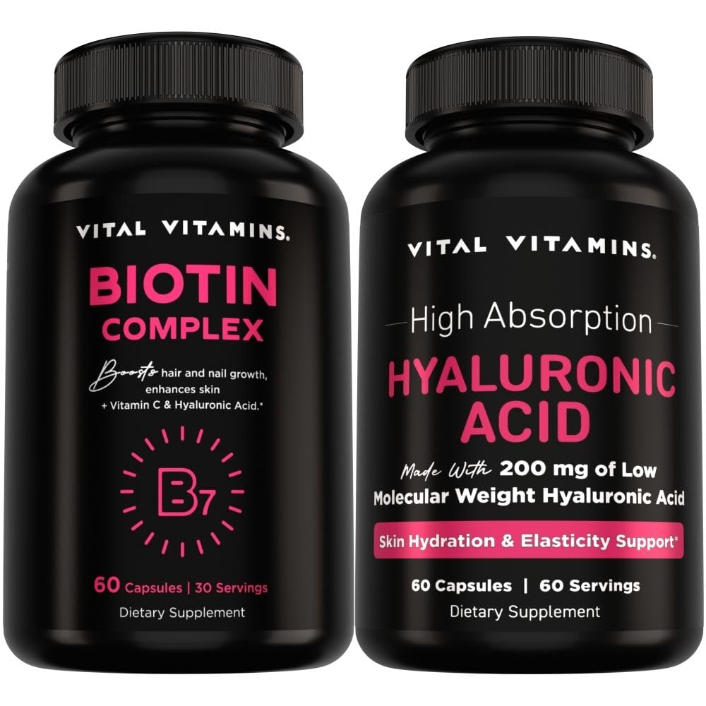 Elevate your daily beauty routine with the Vital Vitamins Beauty Bundle, featuring Biotin Complex and Hyaluronic Acid supplements. Together, they support healthy hair, radiant skin, and strong nails from the inside out. The Biotin Complex delivers essential nutrients like Biotin, Collagen, MSM, and Vitamin C to promote hair and nail strength, while the Hyaluronic Acid supplement helps maintain skin hydration and elasticity for a smooth, youthful-looking complexion. This duo makes it simple to nourish your natural beauty every day.