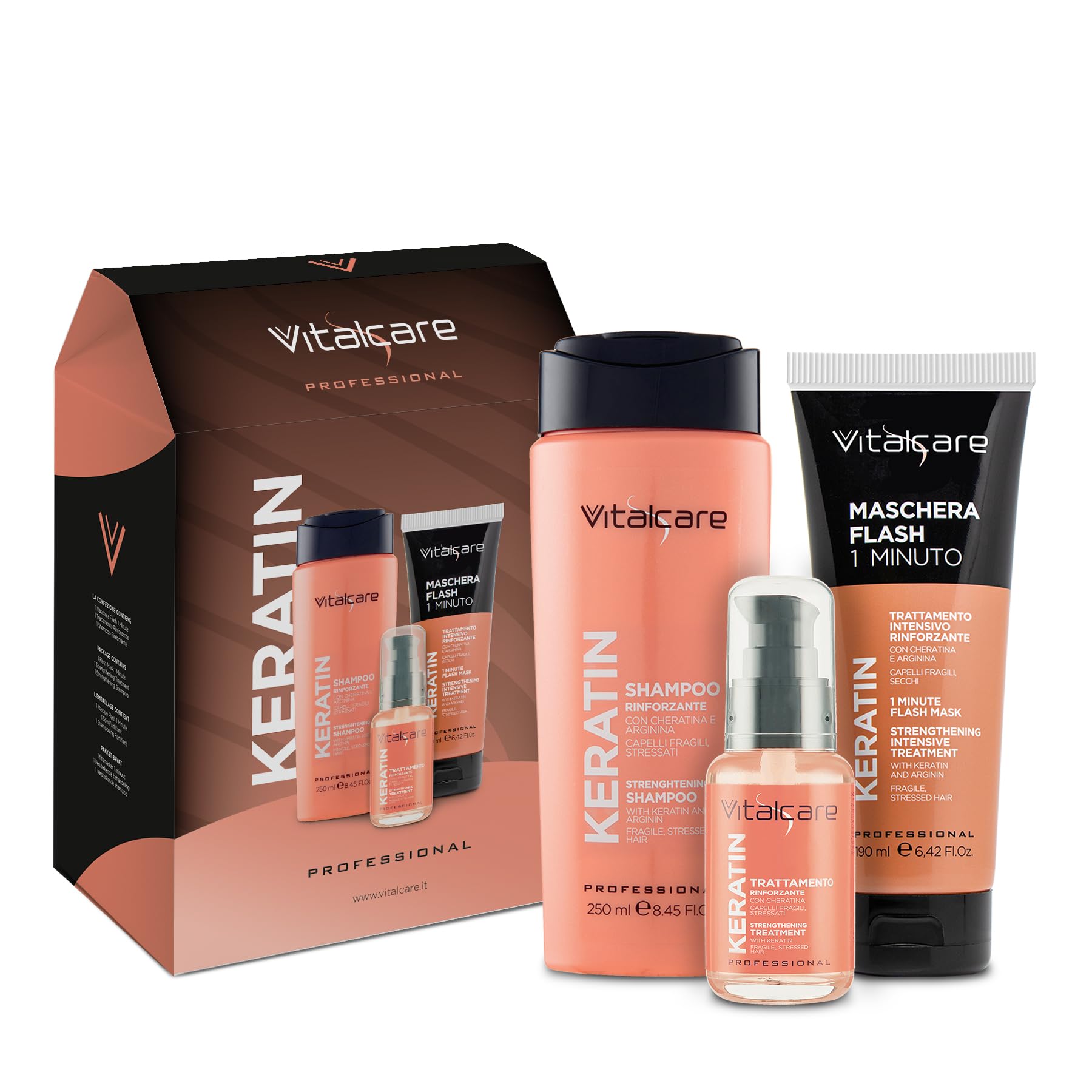 Vitalcare brand products are designed for you and your well-being. Unisex adult hair care products. Vitcare Cofanetto Keratin Shampoo: 250ml Strengthening Shampoo 50ml Strengthening Treatment 1-Minute Flash Mask in a tube by Vitalcare.
