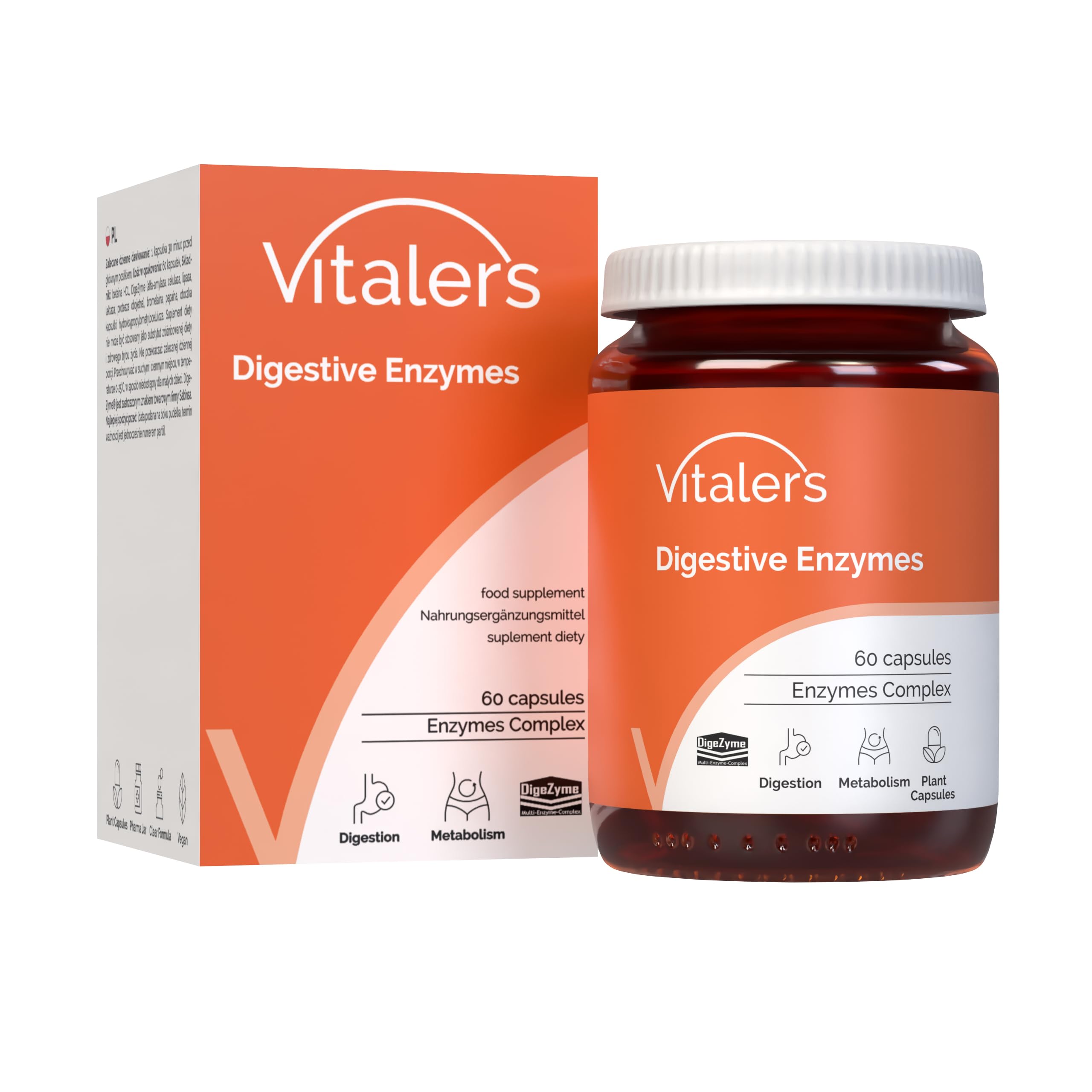 Made in Poland in accordance with the strictest quality standards, including HACCP and GMP regulations, guaranteeing safety and full compliance with quality requirements. All tablets are 100 vegan and vegetarian, with a clean and transparent formula, free of unnecessary additives. The package contains 60 capsules, a two-month supply. The bottle is made of dark glass, which protects the medication from light exposure, preventing the degradation of active ingredients and loss of effectiveness. This helps maintain chemical stability and extend the product's shelf life. By supplementing your diet with these enzymes, your body becomes more efficient at processing proteins, fats, and carbohydrates, which can help reduce bloating, improve nutrient absorption, and make every meal more beneficial for your overall health. Vitaler's digestive enzyme formula is composed exclusively of carefully selected natural ingredients to improve digestion, promote intestinal comfort, and support a healthier overall digestive process. Digestive enzymes help our body to properly assimilate and utilize the nutritional values of the meals we consume, even when following a vegan diet, by promoting the breakdown of complex food compounds into absorbable nutrients.Enzymes digestives Vitaler's - 60 gélules, végétaliennes, 2 mois de supplémentation, sans conservateurs, composition pureFabriqué en Pologne conformément aux normes de qualité les plus strictes, notamment les réglementations HACCP et GMP, garantissant la sécurité et le respect total des exigences de qualité. Tous les comprimés sont 100 végétaliens et végétariens, avec une formule propre et transparente, sans additifs inutiles. Le conditionnement contient 60 gélules, soit une cure de 2 mois. Le flacon est en verre foncé, ce qui protège le médicament de l'exposition à la lumière, empêchant ainsi la dégradation des ingrédients actifs et la perte d'efficacité. Cela permet de maintenir la stabilité chimique et de prolonger la durée de conservation du produit. En complétant votre alimentation avec ces enzymes, votre corps devient plus efficace dans le traitement des protéines, des graisses et des glucides, ce qui peut contribuer à réduire les ballonnements, à améliorer l'absorption des nutriments et à rendre chaque repas plus bénéfique pour votre santé globale. La formule d'enzymes digestives de Vitaler's est composée exclusivement d'ingrédients naturels soigneusement sélectionnés pour améliorer la digestion, favoriser le confort intestinal et soutenir un processus digestif globalement plus sain. Les enzymes digestives aident notre corps à assimiler et à utiliser correctement les valeurs nutritionnelles des repas que nous consommons, même lorsque nous suivons un régime végétalien, en favorisant la décomposition des composés alimentaires complexes en nutriments absorbables.