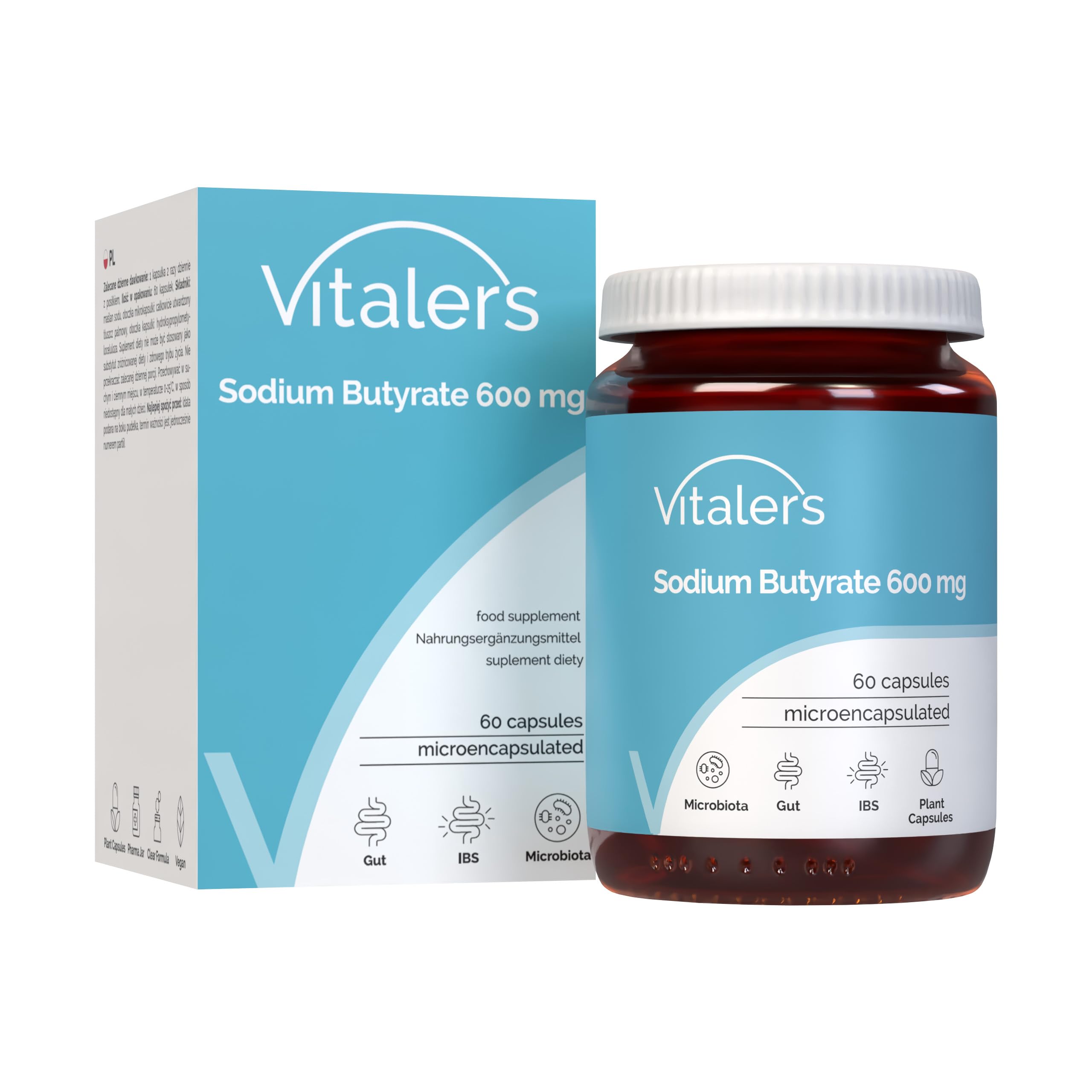 Made in Poland in accordance with the strictest quality standards, including HACCP and GMP regulations, ensuring safety and full compliance with quality requirements. All tablets are 100 vegan and vegetarian, with a clean and transparent formula free of unnecessary additives. The package contains 60 capsules, a one-month supply. The bottle is made of dark glass, protecting the medication from light exposure and preventing the degradation of active ingredients and loss of effectiveness. This helps maintain chemical stability and extend the product's shelf life. Sodium butyrate not only supports digestive health but also plays a role in strengthening the immune system and reducing chronic inflammation. It has been shown to influence immune cell activity and promote the regeneration of intestinal cells, contributing to overall health and well-being. Butyric acid, the main component of sodium butyrate, serves as the primary energy source for colonocytes, the cells that line the colon. This helps promote healthy digestion, improve nutrient absorption, and maintain gut health, making it an excellent option for anyone looking to support their digestive system. Vitaler's Sodium Butyrate provides 600 mg of butyric acid per capsule, which is essential for supporting digestive health and reducing inflammation. The enteric-coated microcapsules ensure that the butyrate is released along the entire length of the small and large intestines, allowing for optimal absorption and effectiveness.Fabriqué en Pologne conformément aux normes de qualité les plus strictes, y compris les réglementations HACCP et GMP, ce qui garantit la sécurité et le respect total des exigences de qualité. Tous les comprimés sont 100 végétaliens et végétariens, avec une formule propre et transparente sans additifs inutiles. L'emballage contient 60 gélules, pour une durée d'un mois. Le flacon est en verre foncé, ce qui protège le médicament de l'exposition à la lumière, empêchant la dégradation des ingrédients actifs et la perte d'efficacité. Cela permet de maintenir la stabilité chimique et de prolonger la durée de conservation du produit. Le butyrate de sodium ne soutient pas seulement la santé digestive, il joue également un rôle dans le renforcement du système immunitaire et la réduction de l'inflammation chronique. Il a été démontré qu'il influence l'activité des cellules immunitaires et favorise la régénération des cellules intestinales, ce qui contribue à la santé et au bien-être général. L'acide butyrique, le principal composant du butyrate de sodium, sert de source d'énergie primaire pour les colonocytes, les cellules qui tapissent le côlon. Cela contribue à promouvoir une digestion saine, à améliorer l'absorption des nutriments et à maintenir la santé intestinale, ce qui en fait une excellente option pour tous ceux qui cherchent à soutenir leur système digestif. Le butyrate de sodium de Vitaler's fournit 600 mg d'acide butyrique par gélule, ce qui est essentiel pour soutenir la santé digestive et réduire l'inflammation. Les microcapsules à enrobage entérique garantissent que le butyrate est libéré sur toute la longueur de l'intestin grêle et du gros intestin, ce qui permet une absorption et une efficacité optimales.Vitaler's Sodium Butyrate - 60 gélules, Végétalien, 1 mois de Supplémentation, Sans Conservateur, Composition Pure