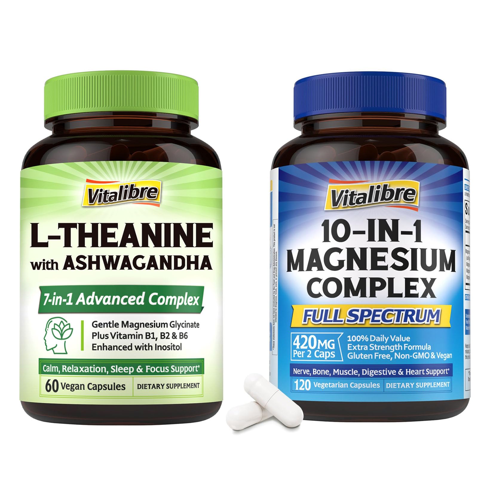 Adaptogenic Mood Support : We go beyond L-Theanine: Ashwagandha adds adaptogenic support for relaxation, while Inositol and B vitamins (B6, B2, B1) help regulate mood, energy levels mental clarity. No overload — just a thoughtful blend designed to help you feel steady and focused, naturally. . Science-Backed Formula For Calm : Our formula pairs 200 mg of calming L-Theanine with gentle Magnesium Glycinate, two well-known ingredients that work together to promote a calm state without diminishing daytime alertness. . Supports Total Body Health : Vitalibre 10-in-1 Magnesium Complex delivers a broader range of health benefits to help improve your common everyday health struggles. Magnesium glycinate complex promotes nerve relaxation for tranquil sleep and brain health, supports healthy muscle cramps for improved exercise performance heart health, and maintains a strong immune and digestion system. . 420mg Elemental Mag (100 DV): Research shows about 75 of Americans can't get enough magnesium from daily diets. Each serving of Vitalibre 10-in-1 Magnesium Complex contains 420 mg of elemental magnesium, which is 100 of the daily recommended value for this vital mineral to help bridge the nutritional gap caused by an unbalanced diet. Vegetarian friendly. Comprehensive 10-Type Magnesium Blend: Say goodbye to magnesium supplements only offering a single magnesium compound and simplify your daily health routine! Our all-in-one formula contains 10 full spectrum types of magnesium in each capsule to provide all the magnesium you need in one supplement, making it a more convenient and cost-friendly choice.