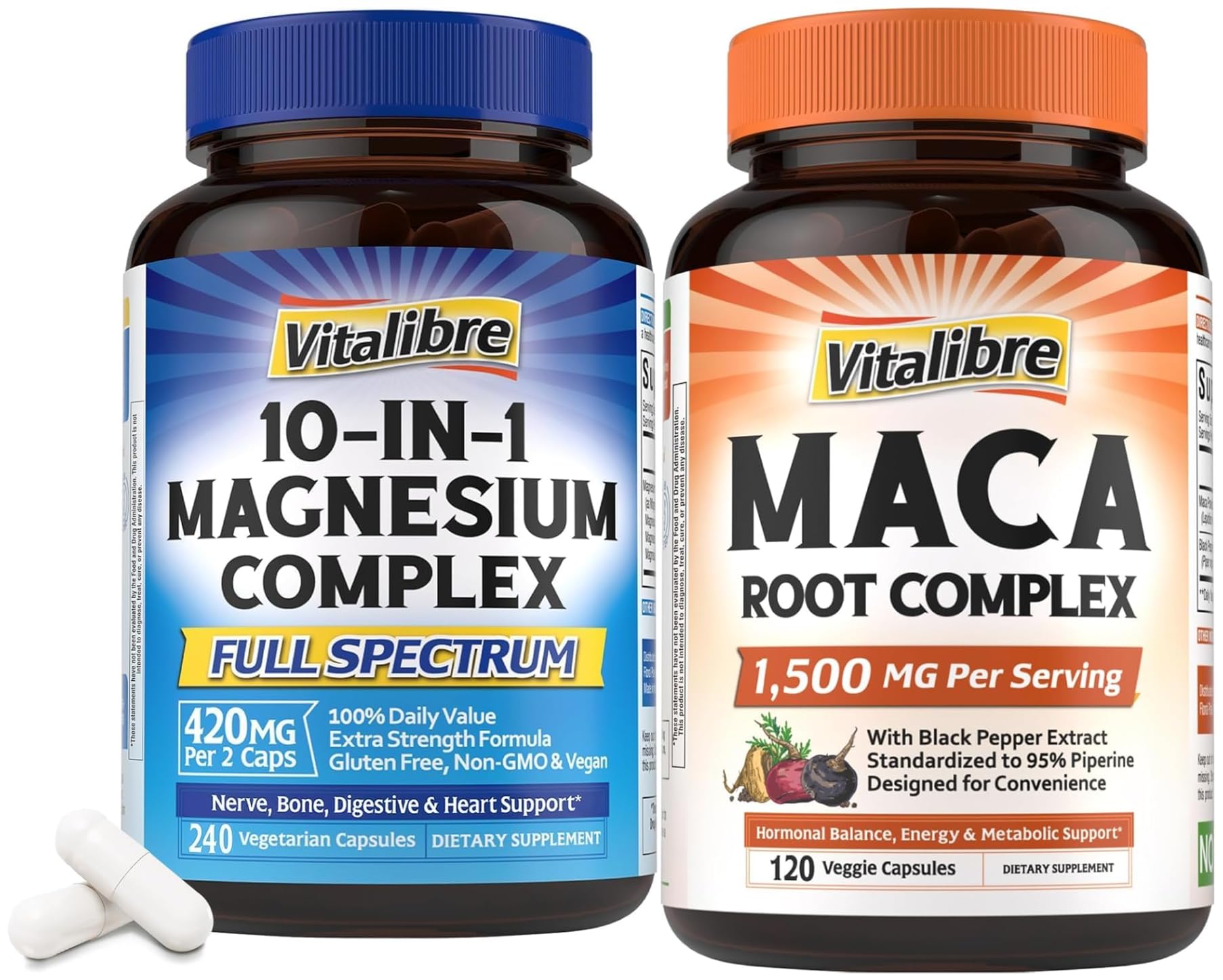 High Quality And Value: From meticulously sourcing the finest, most bioavailable ingredients to rigorously testing each formula, the team behind Vitalibre is driven by a relentless pursuit of purity and potency. Putting aside unnecessary fillers and artificial ingredients, we're committed to transparency in labeling and providing clear information contains zero sugar, gluten, dairy, soy, wheat, eggs, tree nuts peanuts. Black Pepper for Advanced Absorption : Our maca capsules are fortified with black pepper extract - loaded with 95 piperine to make a significant increase on your body's ability to absorb nutrients. Just a touch of black pepper can help unearth the maximum power of maca to ensure you're leaving no benefits buried away. . Max Strength 1500 mg Formula: Our super maca complex delivers a high strength 1500 mg of maca powder per serving, derived from the nutrient-rich root of the plants grown in Peru. Known for its adaptogenic properties, this powerhouse herb supports energy stores, stamina and overall well-being, perfect for fueling your active lifestyle. . 420mg Elemental Mag (100 DV): Research shows about 75 of Americans can't get enough magnesium from daily diets. Each serving of Vitalibre 10-in-1 Magnesium Complex contains 420 mg of elemental magnesium, which is 100 of the daily recommended value for this vital mineral to help bridge the nutritional gap caused by an unbalanced diet. Vegetarian friendly. Comprehensive 10-Type Magnesium Blend: Say goodbye to magnesium supplements only offering a single magnesium compound and simplify your daily health routine! Our all-in-one formula contains 10 full spectrum types of magnesium in each capsule to provide all the magnesium you need in one supplement, making it a more convenient and cost-friendly choice.