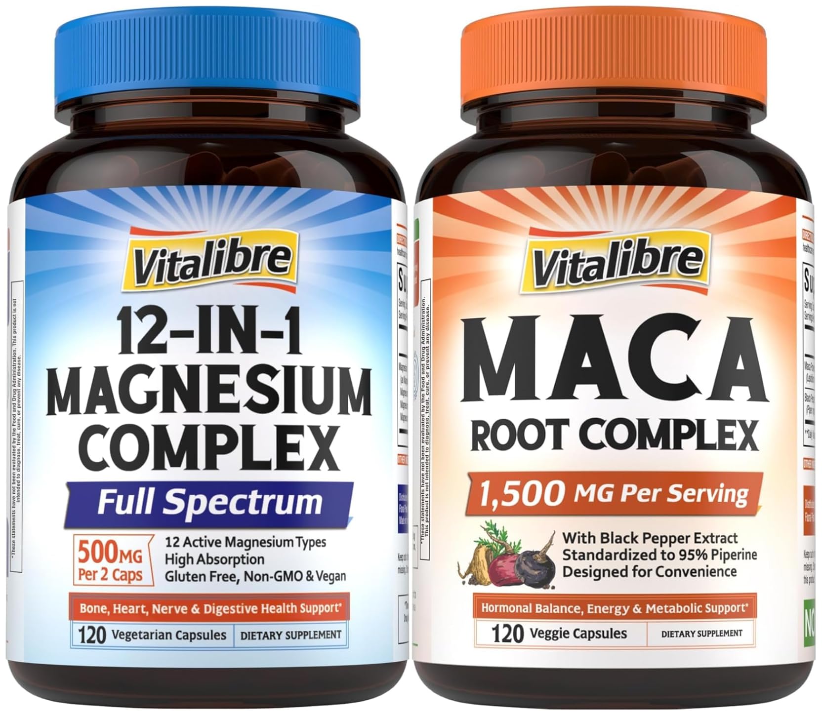 Vitalibre 12 in 1 Magnesium Complex 500mg Maca Root Capsules BundleHigh Quality And Value: From meticulously sourcing the finest, most bioavailable ingredients to rigorously testing each formula, the team behind Vitalibre is driven by a relentless pursuit of purity and potency. Putting aside unnecessary fillers and artificial ingredients, we're committed to transparency in labeling and providing clear information contains zero sugar, gluten, dairy, soy, wheat, eggs, tree nuts peanuts. Black Pepper for Advanced Absorption : Our maca capsules are fortified with black pepper extract - loaded with 95 piperine to make a significant increase on your body's ability to absorb nutrients. Just a touch of black pepper can help unearth the maximum power of maca to ensure you're leaving no benefits buried away. . Max Strength 1500 mg Formula: Our super maca complex delivers a high strength 1500 mg of maca powder per serving, derived from the nutrient-rich root of the plants grown in Peru. Known for its adaptogenic properties, this powerhouse herb supports energy stores, stamina and overall well-being, perfect for fueling your active lifestyle. . Support Sleep, Energy, Heart, Bones Gut Health : Magnesium glycinate and taurate promote healthy nerve function restful sleep, and magnesium malate, aspartate, and succinate support energy production faster recovery. For heart and bone support, magnesium orotate and gluconate provide targeted support, while magnesium citrate, lactate, carbonate, and more boost digestive health regularity. . 12-In-1 Magnesium Complex: Vitalibre Magnesium Complex delivers 12 beneficial forms of magnesium in just 2 easy-to-swallow capsules, providing broad-spectrum health support without the need for multiple supplements. Carefully formulated with gentle, highly bioavailable forms like magnesium glycinate and magnesium malate, it ensures superior absorption without causing digestive discomfort.