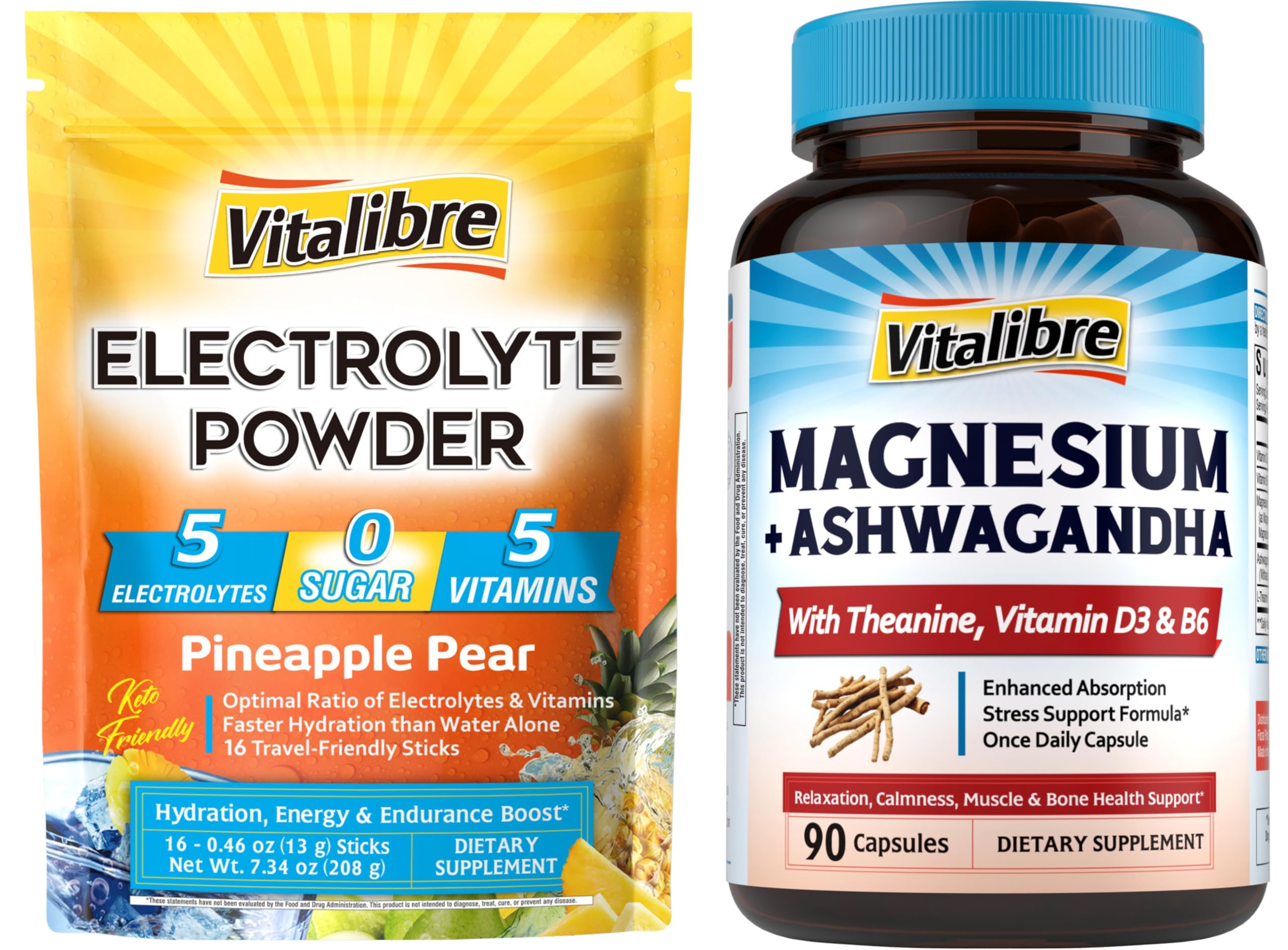 Made With You In Mind: Combining nature's nutrients with science-backed formulas, we create our first line of clean supplements to help you make confident choices for your health. We are proud to affirm all Vitalibre products are manufactured in the U.S in facilities that adhere to strict Good Manufacturing Practices (GMP) guidelines. With Ashwagandha Theanine: Ashwagandha is a powerful adaptogen known for reducing cortisol levels and promoting a calm, focused mind, while L-Theanine promotes a calm yet alert mental state without drowsiness. Paired with 5 types of magnesium, vitamin D3 B6, this formula helps create a sense of calm clarity - perfect for a more productive and relaxed day. . The Most Bioavailable Magnesium Complex: Vitalibre Magnesium Ashwagandha Complex Supplement uses magnesium glycinate for its high bioavailability and gentle effect on the stomach. This highly absorbable form features the highest GI tolerance and absorption. Zero Sugar Natural Fruity Flavor: Vitalibre Electrolyte Powder helps quench your thirst and defeat dehydration. Naturally flavored with real fruits (pineapple pear) and added with NO sugar, our delicious electrolyte is designed for people to live an active, low-carb, and keto-friendly lifestyle. Toss a portable stick pack in your gym bag, hiking pack, or anywhere you need a tasty hydrating boost. . Vitalibre Electrolytes Powder Hydration Boost : If you've ever done some Serious sweating, your body loses vital electrolytes and energy. Refuel with Vitalibre Electrolyte Powder, powered by a perfect-ratio blend of 5 electrolytes (calcium, magnesium, chloride, sodium, potassium) and 5 vitamins (vitamin C, niacin, B5, B6, B12). Simply mix it with water and enjoy your refreshing beverage for fast hydration and peak performance. .