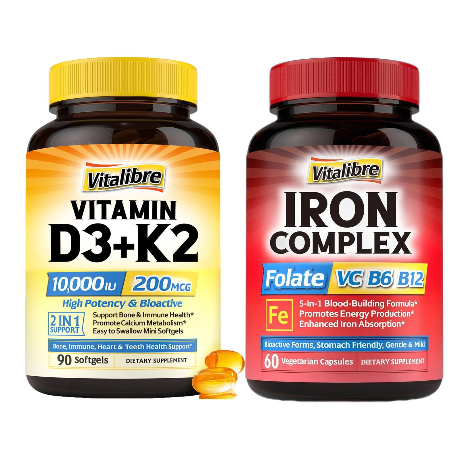 Iron Supplement for Women Men, with Vitamins C, B6, B12 Folate for Iron Deficiency Vitamin D3 K2 10000 IU D3 200 mcg K2 MK7 K2 D3 Vitamin Supplement.High Potency D3 K2 Vitamin 10000 IU: Each mini softgel delivers 10000 IU of the same bioactive vitamin D3 naturally produced in your body from direct sunlight and 200mcg of Vitamin K2 (as MK-7, the form of K2 with the highest bioavailability). Enjoy sunshine replenishment with Vitalibre Max Strength Vitamin D3 K2 no matter what the weather is like! . Best Combination of Vitamin D3 K2: Did you know vitamin D3 and K2 work better together? Vitamin D3 helps your body absorb calcium, while vitamin K2 directs calcium to your bones. Our 2-in-1 k2 d3 vitamin supplement provides greater bone, teeth, muscle, heart and immune function support. . Boost Energy Immune Health : By supporting healthy red blood cells, Vitalibre vegan iron supplement helps boost oxygen transportation, bringing you long-lasting energy, robust immune system, better muscle function, and enhanced workout performance. Loaded with essential B vitamins and natural vitamin C, this Iron Complex also helps support the conversion of food into energy and promote antioxidant capacity. . 5-IN-1 Blood-Building Formula : Our gentle iron pills provide the most natural and bioactive forms of blood vitamins including 667 mcg folate (as L-5-MTHF), 30 mcg of methyl B12, and 5 mg of bioactive B6 (P-5-P), the vital nutrients required for hemoglobin formation and red blood cell production, along with 30 mg of natural vitamin C to enhance iron absorption. . Non-Constipating Iron Bisglycinate: Vitalibre Iron Complex provides 36 mg of elemental iron in a gentle, well-absorbed form as iron bisglycinate (ferrous bisglycinate), which boosts your iron levels without unwanted digestive issues like nausea or constipation. This iron supplement is great for individuals with increased iron needs, such as menstruating women, pregnant women, vegans, vegetarians, athletes recent blood donors. .