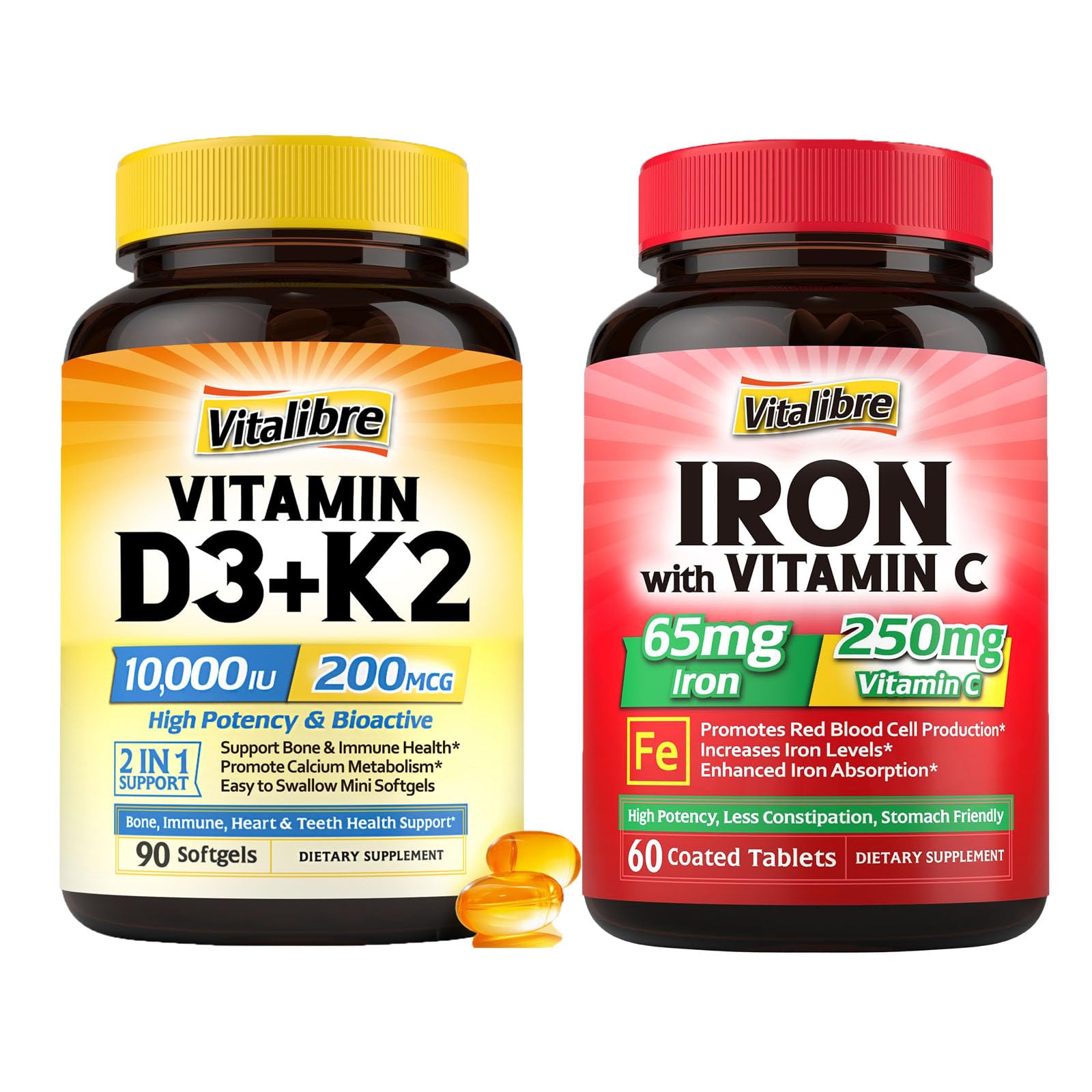 High Potency D3 K2 Vitamin 10000 IU: Each mini softgel delivers 10000 IU of the same bioactive vitamin D3 naturally produced in your body from direct sunlight and 200mcg of Vitamin K2 (as MK-7, the form of K2 with the highest bioavailability). Enjoy sunshine replenishment with Vitalibre Max Strength Vitamin D3 K2 no matter what the weather is like! . Best Combination of Vitamin D3 K2: Did you know vitamin D3 and K2 work better together? Vitamin D3 helps your body absorb calcium, while vitamin K2 directs calcium to your bones. Our 2-in-1 k2 d3 vitamin supplement provides greater bone, teeth, muscle, heart and immune function support. . Support Healthy Red Blood Cell Production: Our iron pills contains enough elemental iron for your body to make enough hemoglobin (carrying oxygen from the lungs to all parts of the body) and myoglobin (transporting oxygen to muscles ). When you keep normal iron levels and healthy red blood cell production, every cell in your body has sufficient oxygen to produce energy for everyday life without feelings of fatigue and dizziness. . Easy to Swallow Gentle on the Stomach: Carbonyl Iron has superior bioavailability and gentle absorption. Substantially less carbonyl iron is required to achieve the same daily intake levels compared with ferrous salts (e.g., ferrous sulfate, ferrous fumarate or ferrous gluconate), resulting in fewer unwanted digestive issues like nausea, upset tummy, or constipation. . Ideal For Individuals With Iron Deficiency : Our high-potency iron supplement is specially formulated for individuals suffering from low iron levels. One small coated tablet contains 65 mg of elemental iron, providing you with 361 of the Daily Value, along with 250 mg of vitamin C to enhance iron absorption while also providing additional immune support and antioxidant benefits. .