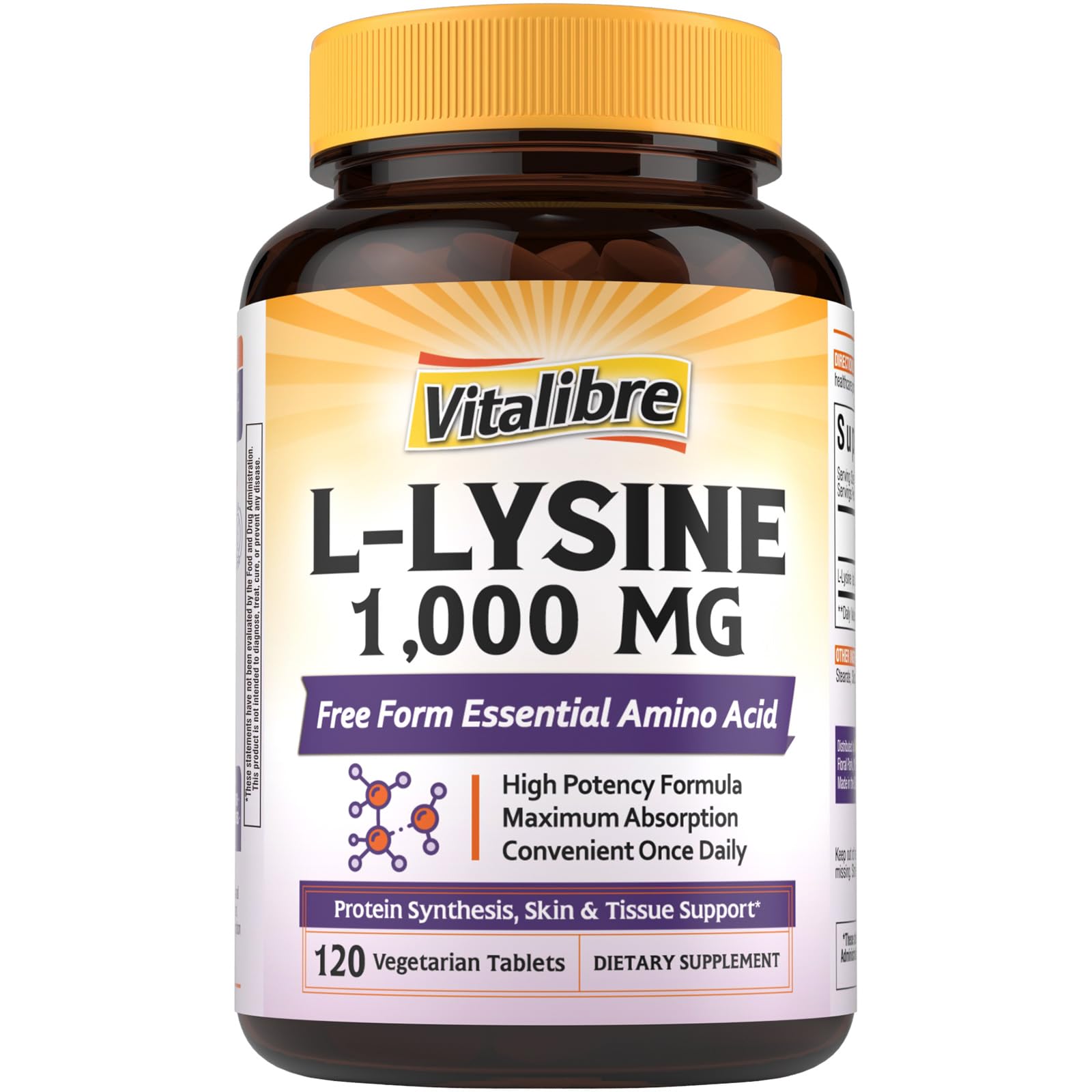 Simple Ingredient: We're committed to transparency in labeling and providing clear information contains zero sugar, dairy, soy, wheat, eggs, tree nuts peanuts. All Vitalibre supplements are Non-GMO and gluten free. Made With You In Mind: From meticulously sourcing the finest, most bioavailable ingredients to rigorously testing each formula, the team behind Vitalibre is driven by a relentless pursuit of purity and potency. High Quality And Value: We are proud to affirm all Vitalibre products are manufactured in the U.S in facilities that adhere to strict Good Manufacturing Practices (GMP) guidelines. Every Vitalibre product is tested by qualified labs for the highest quality. Comprehensive Immune System Support : Lysine is particularly valued for its ability to support your body's natural immune defenses throughout the year. This essential amino acid helps support the production of antibodies, enzymes, and hormones that are vital for immune response and overall wellness . Maximum Strength 1000mg L-Lysine: Each capsule delivers a powerful 1000mg dose of pure L-Lysine from high-quality Lysine Hydrochloride (HCl), providing optimal levels of this essential amino acid that your body cannot produce on its own. This high-potency formula ensures you receive healthy and balanced levels of lysine to support multiple aspects of your health, from immune function to protein synthesis .