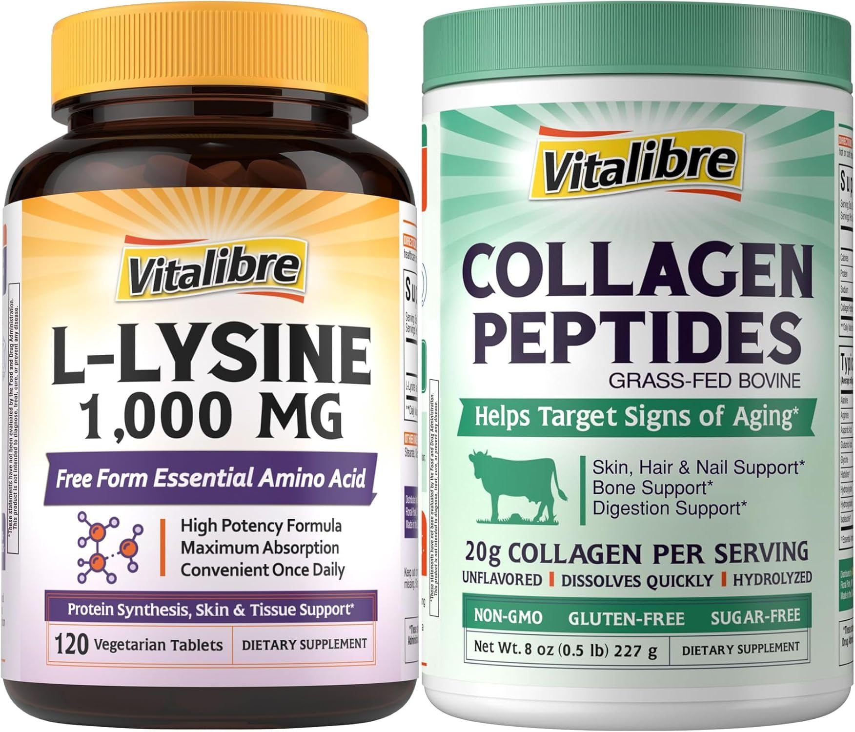 Simple Ingredient: We're committed to transparency in labeling and providing clear information contains zero sugar, dairy, soy, wheat, eggs, tree nuts peanuts. All Vitalibre supplements are Non-GMO and gluten free. Collagen for Women Men: As we age, our natural collagen levels begin to decline, leading to a range of visible signs of aging. Our Bovine Collagen Peptides, rich in types I and III, is designed to combat these effects by reducing the appearance of fine lines and wrinkles, enhancing the strength and luster of hair and nails, promoting overall bone health, and supporting gut integrity and digestion . 100 Pure Hydrolyzed Bovine Collagen: Sourced from grass-fed, pasture-raised cows that roam freely and are raised without antibiotics or growth hormones, our bovine collagen is expertly hydrolyzed for maximum bioavailability. This ensures easy absorption by your body, providing support for healthy skin, hair, nails, bones, and digestion . Comprehensive Immune System Support : Lysine is particularly valued for its ability to support your body's natural immune defenses throughout the year. This essential amino acid helps support the production of antibodies, enzymes, and hormones that are vital for immune response and overall wellness . Maximum Strength 1000mg L-Lysine: Each capsule delivers a powerful 1000mg dose of pure L-Lysine from high-quality Lysine Hydrochloride (HCl), providing optimal levels of this essential amino acid that your body cannot produce on its own. This high-potency formula ensures you receive healthy and balanced levels of lysine to support multiple aspects of your health, from immune function to protein synthesis .