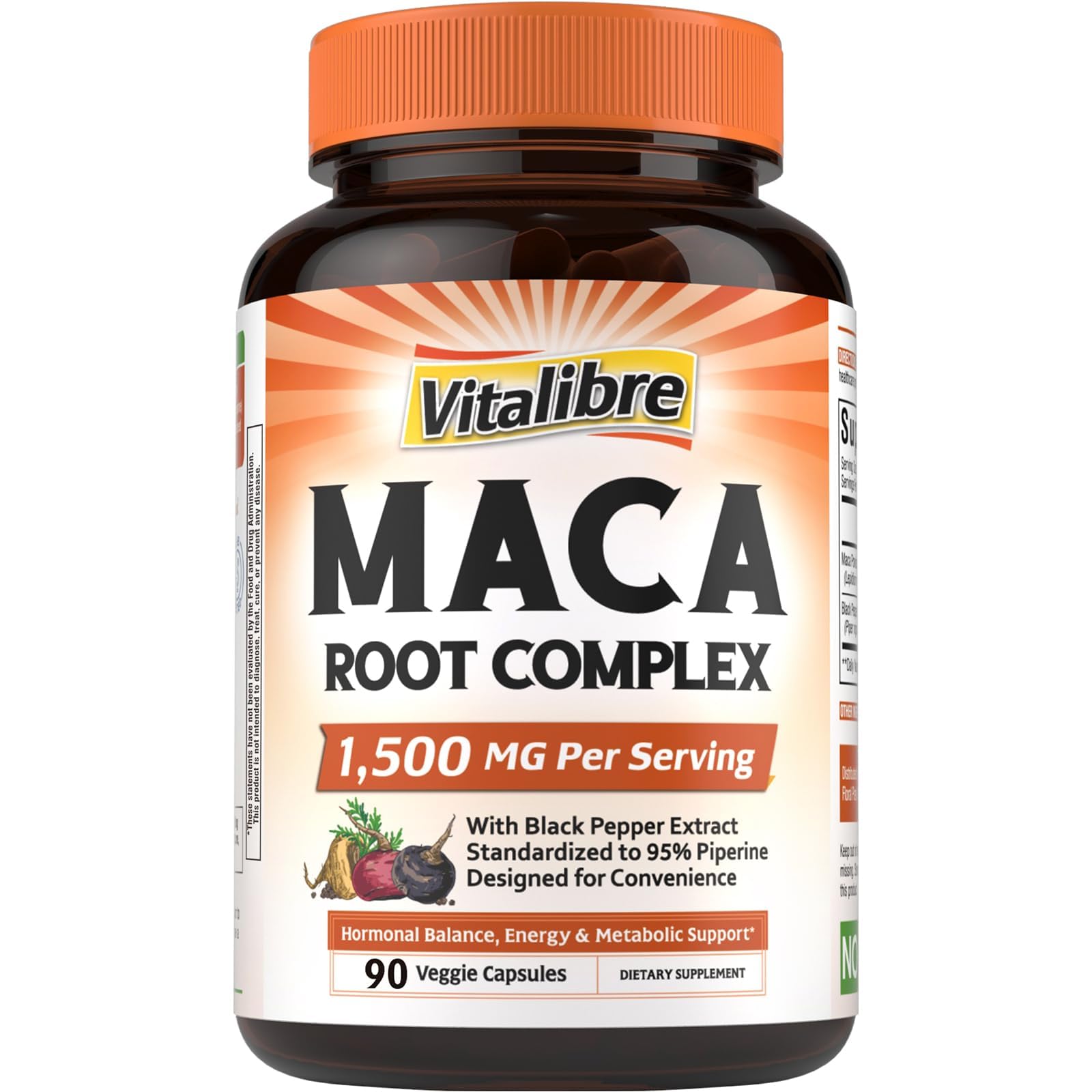 High Quality And Value: From meticulously sourcing the finest, most bioavailable ingredients to rigorously testing each formula, the team behind Vitalibre is driven by a relentless pursuit of purity and potency. Putting aside unnecessary fillers and artificial ingredients, we're committed to transparency in labeling and providing clear information contains zero sugar, gluten, dairy, soy, wheat, eggs, tree nuts peanuts. Made With You In Mind: Combining nature's nutrients with carefully crafted formulas, we create our first line of clean supplements to help you make confident choices for your health. We are proud to affirm all Vitalibre products are manufactured in the U.S in facilities that adhere to strict Good Manufacturing Practices (GMP) guidelines. Hormonal Balance, Energy Metabolic Support : Maca is revered for its ability to balance hormones, increase energy levels, and support metabolic function. From enhanced stamina, mood to reproductive health vitality, this herbal energizer can get you where you need to be. . Black Pepper for Advanced Absorption : Our maca capsules are fortified with black pepper extract - loaded with 95 piperine to make a significant increase on your body's ability to absorb nutrients. Just a touch of black pepper can help unearth the maximum power of maca to ensure you're leaving no benefits buried away. . Max Strength 1500 mg Formula: Our super maca complex delivers a high strength 1500 mg of maca powder per serving, derived from the nutrient-rich root of the plants grown in Peru. Known for its adaptogenic properties, this powerhouse herb supports energy stores, stamina and overall well-being, perfect for fueling your active lifestyle. .
