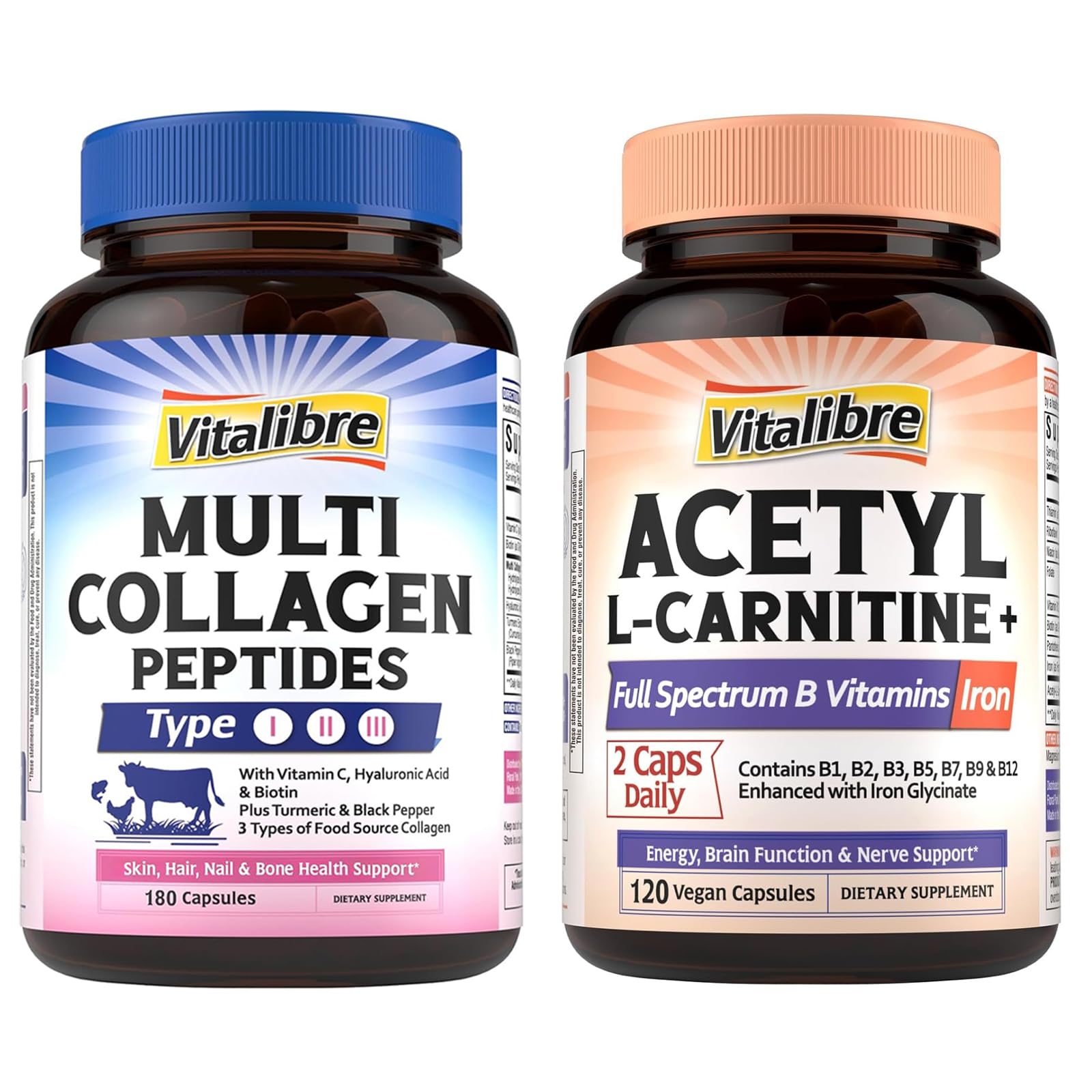 Made With You In Mind: Combining nature's nutrients with science-backed formulas, we create our first line of clean supplements to help you make confident choices for your health. We are proud to affirm all Vitalibre products are manufactured in the U.S in facilities that adhere to strict Good Manufacturing Practices (GMP) guidelines.Complete B Vitamin Complex Iron: Our Acetyl-L-Carnitine includes a full-spectrum B complex (B1, B2, flush-free B3, B5, biotin, B9, methyl B12) to help convert food into energy, support the nervous system. Iron is thoughtfully added to promote oxygen transport—perfect for all-day mental and physical stamina. . Advanced Brain Support with ALCAR : Vitalibre Acetyl-L-Carnitine features Acetyl-L-Carnitine Hydrochloride (ALCAR), a highly bioavailable form known for crossing the blood-brain barrier to support mental clarity, focus, and memory. . Move Freely with Collagen Turmeric : Ageless collagen meets time-honored turmeric — a powerful duo for mobility and flexibility. Our collagen blends with antioxidant-rich turmeric and black pepper to support smooth movement and post-exercise recovery, helping you stay active and feel your best every day. Black pepper also enhances absorption for optimal results . Look Your Best with Biotin Hyaluronic Acid : Struggling with dull skin, dry hair, or brittle nails? Try our premium multi-collagen packed with biotin and hyaluronic acid to retain your natural glow. Bioactive d-biotin supports hair strength by stimulating follicles, while HA locks in moisture to plump up the skin and reduce fine lines. Just 3 capsules a day to reveal your age-defying beauty . Advanced Collagen Profile: Our formula features hydrolyzed collagen types I, II, and III from grass-fed cows, cage-free chickens, and wild-caught fish. With vitamin C to support collagen synthesis, it helps replenish and rejuvenate your body from within. Enhanced with biotin, hyaluronic acid, turmeric, and black pepper, this 6-in-1 complex is your ultimate anti-aging solution for youthful renewal .