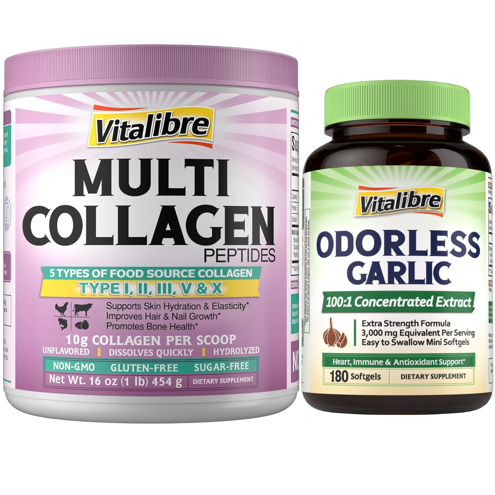 16oz Multi Collagen Peptides Powder Type I II III V X Odorless Garlic 180 SoftgelsWellness Starts At The Heart : Garlic is celebrated for its beneficial properties that support heart function, immune strength, and antioxidant defense. With 2 softgels a day, Vitalibre Odorless Garlic helps regulate blood cholesterol levels, promote healthy circulation, and keep your heart functioning at its best. It also strengthens immune response and offers antioxidant defense. . Pure Power, No Odor: Not your average garlic supplement — Vitalibre Odorless Garlic is your best answer to harnessing the benefits of garlic without the unpleasant smell. It delivers 30 mg of ultra-concentrated 100:1 garlic oil extract — equal to a whopping 3,000 mg of fresh garlic in just 2 easy-to-swallow softgels. Unflavored Quick Dissolve: One scoop with 9g of protein and 18 amino acids for your daily routine. It dissolves quickly in hot or cold liquids without flavor or odor, perfect for coffee, tea, smoothies, or your favorite recipes. Contains zero sugar, artificial colors, flavors or sweeteners gluten, dairy soy free Non-GMO, keto paleo friendly. Enhance Beauty From Within : Experience the transformative effects of collagen types I and III for skin hydration and elasticity, while collagen types V and X strengthen your hair and nails for a healthier appearance. And, collagen type II promotes bone health, helping you maintain an active lifestyle with ease and comfort . Multi-Source Collagen Peptide Blend: Our advanced formula combines the benefits of all 5 collagen types (I, II, III, V X) - sourced from the grass-fed, pasture-raised cows, wild-caught fish, cage-free chicken, and fermented eggshell membrane - that ensures comprehensive support for your skin, hair, nails, and bones, delivering optimal health benefits for your entire body .