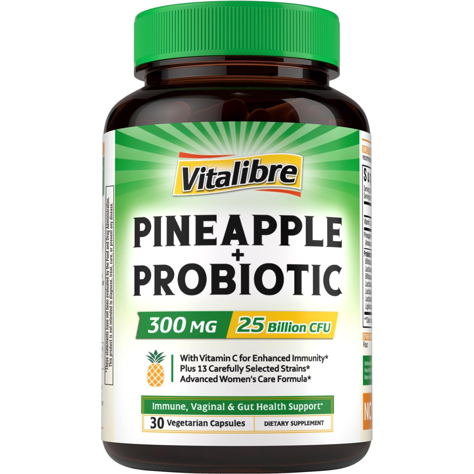 High Quality And Value: From meticulously sourcing the finest, most bioavailable ingredients to rigorously testing each formula, the team behind Vitalibre is driven by a relentless pursuit of purity and potency. Putting aside unnecessary fillers and artificial ingredients, we're committed to transparency in labeling and providing clear information contains zero sugar, gluten, dairy, soy, wheat, eggs, tree nuts peanuts. Made With You In Mind: Combining nature's nutrients with carefully-crafted formulas, we create our first line of clean supplements to help you make confident choices for your health. We are proud to affirm all Vitalibre products are manufactured in the U.S in facilities that adhere to strict Good Manufacturing Practices (GMP) guidelines. Immune Boosting Power : Natural pineapple powder and 90 mg of vitamin C join forces to support your immune system. Pineapple's antioxidants help neutralize free radicals, while vitamin C fuels your body's immune cells. Together, they deliver comprehensive support to help keep you strong and healthy even in periods and cold weather. . Natural Gut Helper : The real pineapple powder in our formula provides natural enzymes to promote the breakdown of whole food macronutrients like proteins and ease occasional bloating. Paired with 25 billion CFUs from 13 strains, this combination helps you balance gut critters, nourish digestive system, and wave goodbye to GI discomfort. . Pineapple Probiotics VC for Women's Health : Vitalibre Pineapple Probiotics is an ideal choice for women looking to maintain feminine vitality and well-being. Specially formulated to support vaginal health, it combines 300 mg of natural pineapple fruit powder with 13 carefully-selected probiotics strains natural vitamin C to promote optimal vaginal health, freshness, and comfort. .