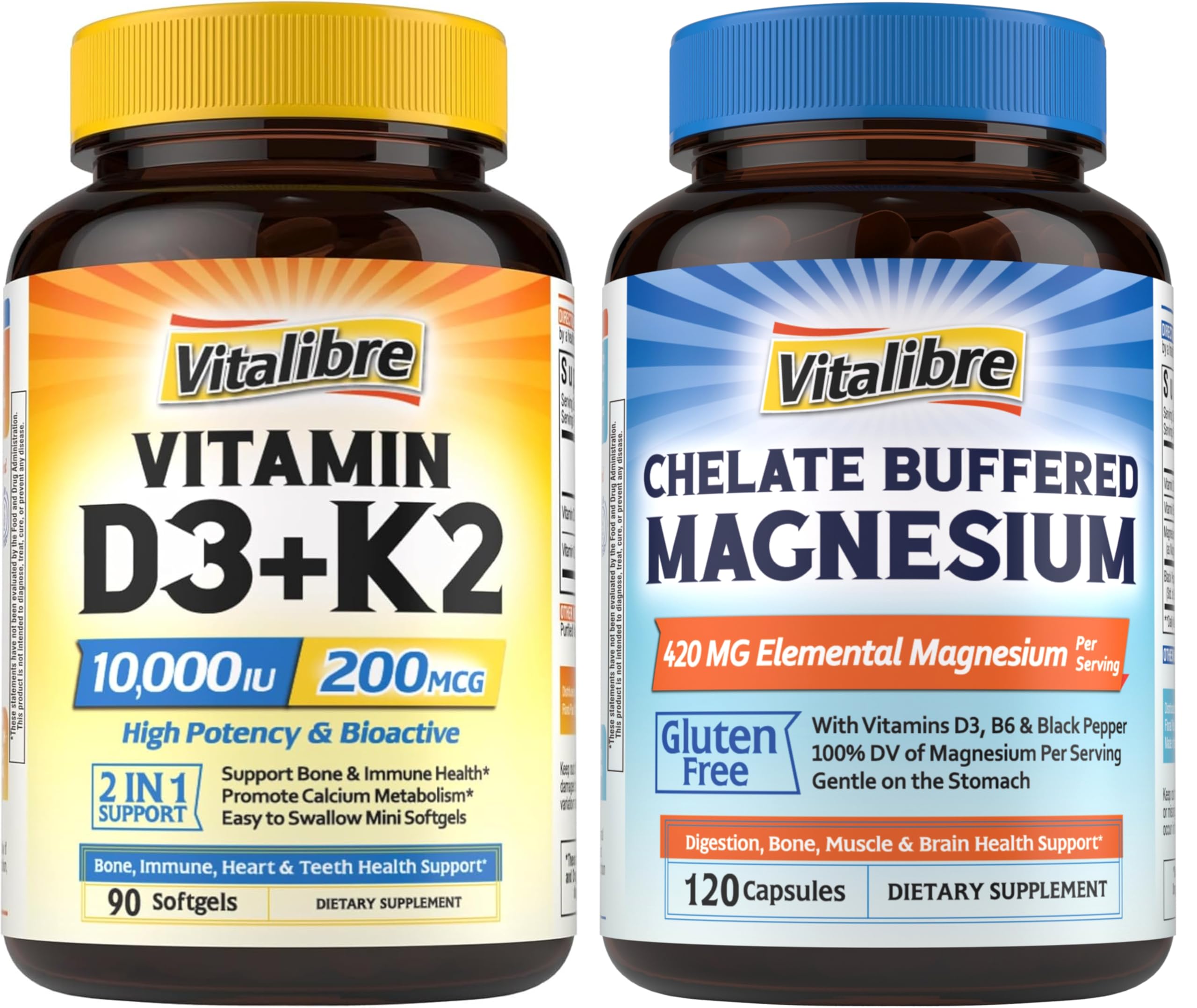 Made With You In Mind: Combining nature's nutrients with science-backed formulas, we create our first line of clean supplements to help you make confident choices for your health. We are proud to affirm all Vitalibre products are manufactured in the U.S in facilities that adhere to strict Good Manufacturing Practices (GMP) guidelines. 420mg Elemental Mag (100 DV): Research shows about 75 of Americans can't get enough magnesium from daily diets. Each serving of Vitalibre Magnesium Citrate Complex contains 420 mg of elemental magnesium, which is 100 of the daily recommended value for this vital mineral to help bridge the nutritional gap caused by an unbalanced diet. . Magnesium Vitamins B6 D3: Vitalibre Magnesium Citrate is formulated with 420 mg of elemental magnesium, 100 of the daily recommended value for this vital mineral per two capsules. Enhanced with bioactive vitamin B6 D3 and black pepper extract, this magnesium formula features superior absorption. High Potency D3 K2 Vitamin 10000 IU: Each mini softgel delivers 10000 IU of the same bioactive vitamin D3 naturally produced in your body from direct sunlight and 200mcg of Vitamin K2 (as MK-7, the form of K2 with the highest bioavailability). Enjoy sunshine replenishment with Vitalibre Max Strength Vitamin D3 K2 no matter what the weather is like! . Best Combination of Vitamin D3 K2: Did you know vitamin D3 and K2 work better together? Vitamin D3 helps your body absorb calcium, while vitamin K2 directs calcium to your bones. Our 2-in-1 k2 d3 vitamin supplement provides greater bone, teeth, muscle, heart and immune function support. .