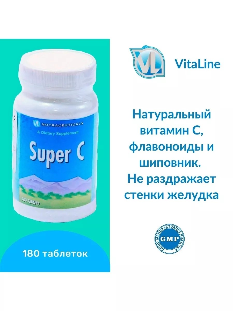 Super C Vitaline - natural vitamin C, flavonoids and rose hips. Does not irritate the stomach lining. INGREDIENTS: Calcium ascorbate - 200 mg; Rosehip extract - 50 mg; Citrus flavonoids - 20 mg. EFFECT ON THE BODY: source of flavonoids, additional source of vitamin C; the main component of oxidation-reduction processes in cells, participation in the synthesis of amino acids, in the processes of neutron transport at the final stages of tissue respiration; antioxidant effect, including the conversion of oxidized vitamin E into its normal form; stabilization of cell membranes, reduction of capillary wall permeability, restoration of vascular elasticity; restoration of collagen and its protection from free radicals; improvement of absorption of a very important microelement - selenium. SUGGESTED USE: Chronic and acute infectious diseases, especially those associated with hemorrhagic syndrome; rheumatoid arthritis, hemorrhagic vasculitis, and other autoimmune diseases; rejuvenation programs in cosmetology. DIRECTIONS: Take 1 to 4 tablets once daily. Duration of treatment: 1 month. Repeat treatment if necessary. Consult a physician before use. CONTRAINDICATIONS: Individual intolerance to any of the product's components. Pregnant and lactating women are advised to consult a physician.