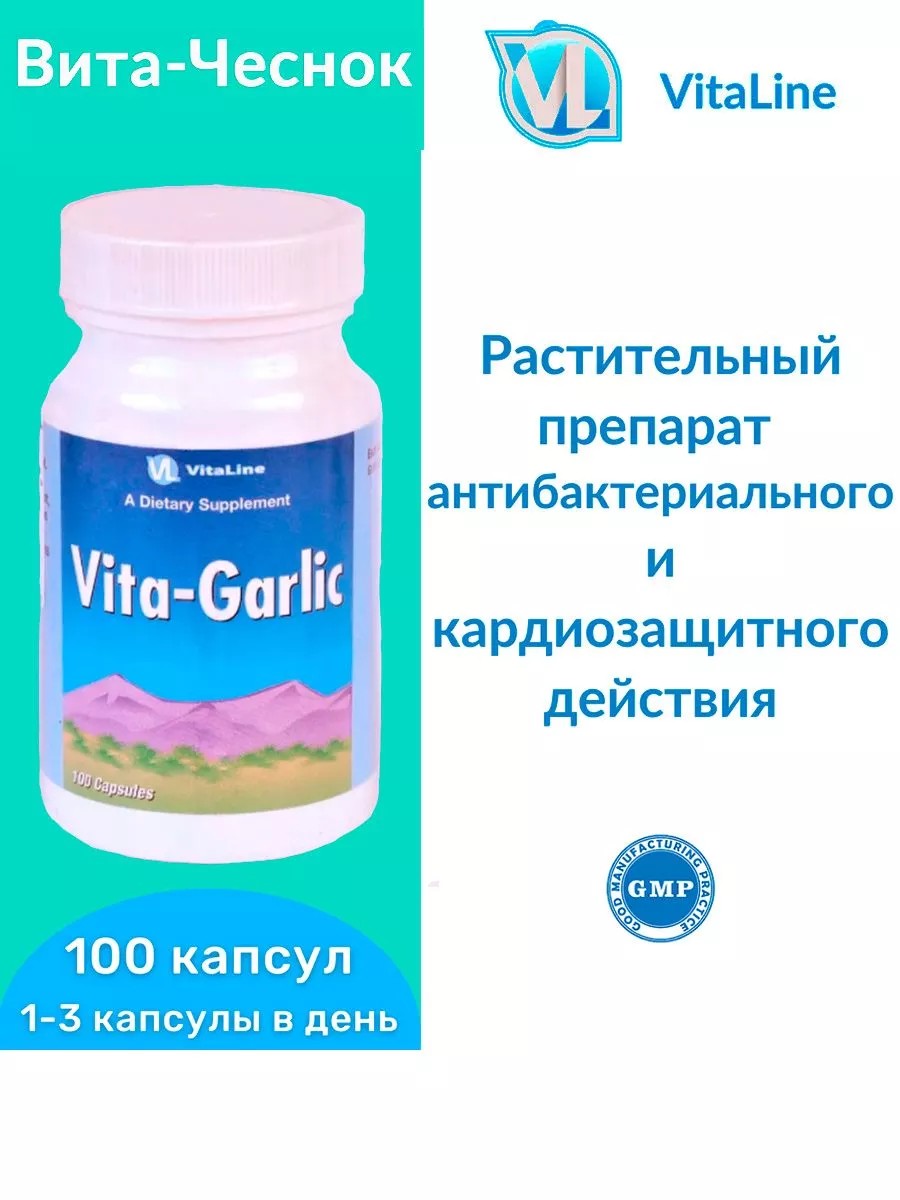 Вита-Чеснок Виталайн / Vita-Garlic Vitaline - растительный препарат антибактериального и кардиозащитного действия. СОСТАВ: порошок чеснока - 500 мг. ДЕЙСТВИЕ НА ОРГАНИЗМ: источник аллицина; антиоксидантное; антибактериальное; антивирусное; стимулирует иммунитет, благотворно воздействует на рост и деление клеток, вызывает омолаживающий эффект; снижает липиды крови, подавляет синтез холестерина; снижает свертываемость крови; снижает артериальное давление; снижает сахар в крови (в небольшой степени). РЕКОМЕНДАЦИИ К ПРИМЕНЕНИЮ: лечение и профилактика простудных и инфекционных заболеваний; лечение и профилактика атеросклероза, постинсультных и постинфарктных состояний, реабилитация больных, перенесших операцию на сердце и сосудах; профилактика онкологических заболеваний; лечение гельминтозов, глистогонный эффект; лечение мужской импотенции, связанной с атеросклеротическим поражением сосудов; профилактика приступов мигрени (при постоянном приеме препарата). СПОСОБ ПРИМЕНЕНИЯ: взрослым по 1 капсуле 1-3 раза в день во время еды. Длительность приема - 1-2 месяца. При необходимости прием можно повторить. Перед применением рекомендуется проконсультироваться с врачом. ПРОТИВОПОКАЗАНИЯ: индивидуальная непереносимость компонентов продукта. Беременным и кормящим женщинам рекомендуется проконсультироваться с врачом.