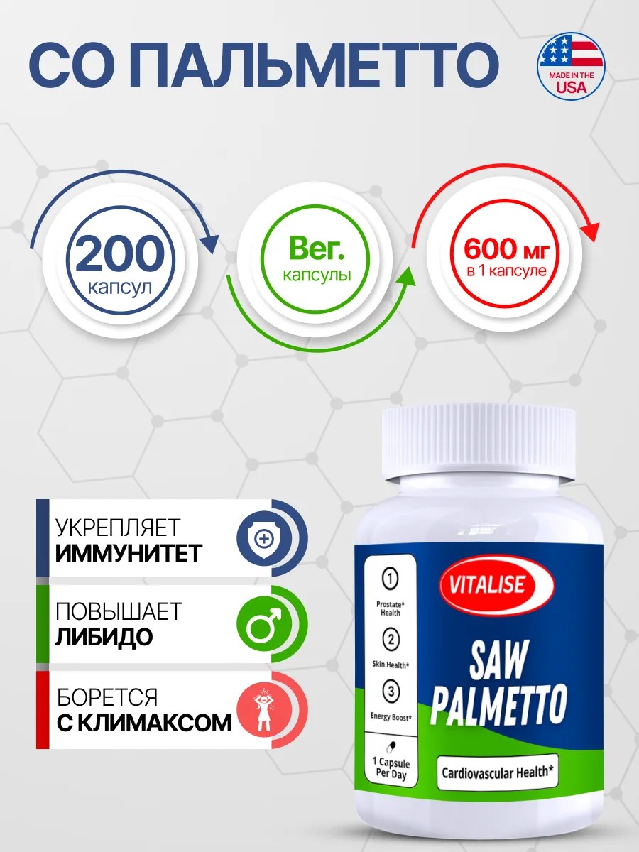Эта добавка также помогает укрепить волосы, снижая их выпадение, и поддерживает здоровье кожи. Со Пальметто полезен как для мужчин, стремящихся сохранить мужское здоровье, так и для женщин, которым важен гормональный баланс.