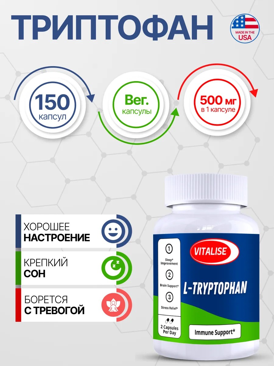 Поддержите своё эмоциональное и физическое здоровье с помощью триптофана! L Триптофан — это незаменимая аминокислота, которая способствует улучшению настроения, снижению стресса и поддержанию здорового сна. Он необходим для синтеза серотонина — гормона, который помогает бороться с депрессией, поддерживать эмоциональное равновесие и улучшать качество сна. Триптофан также обладает успокоительным эффектом, помогая снизить уровень тревожности и стресса.