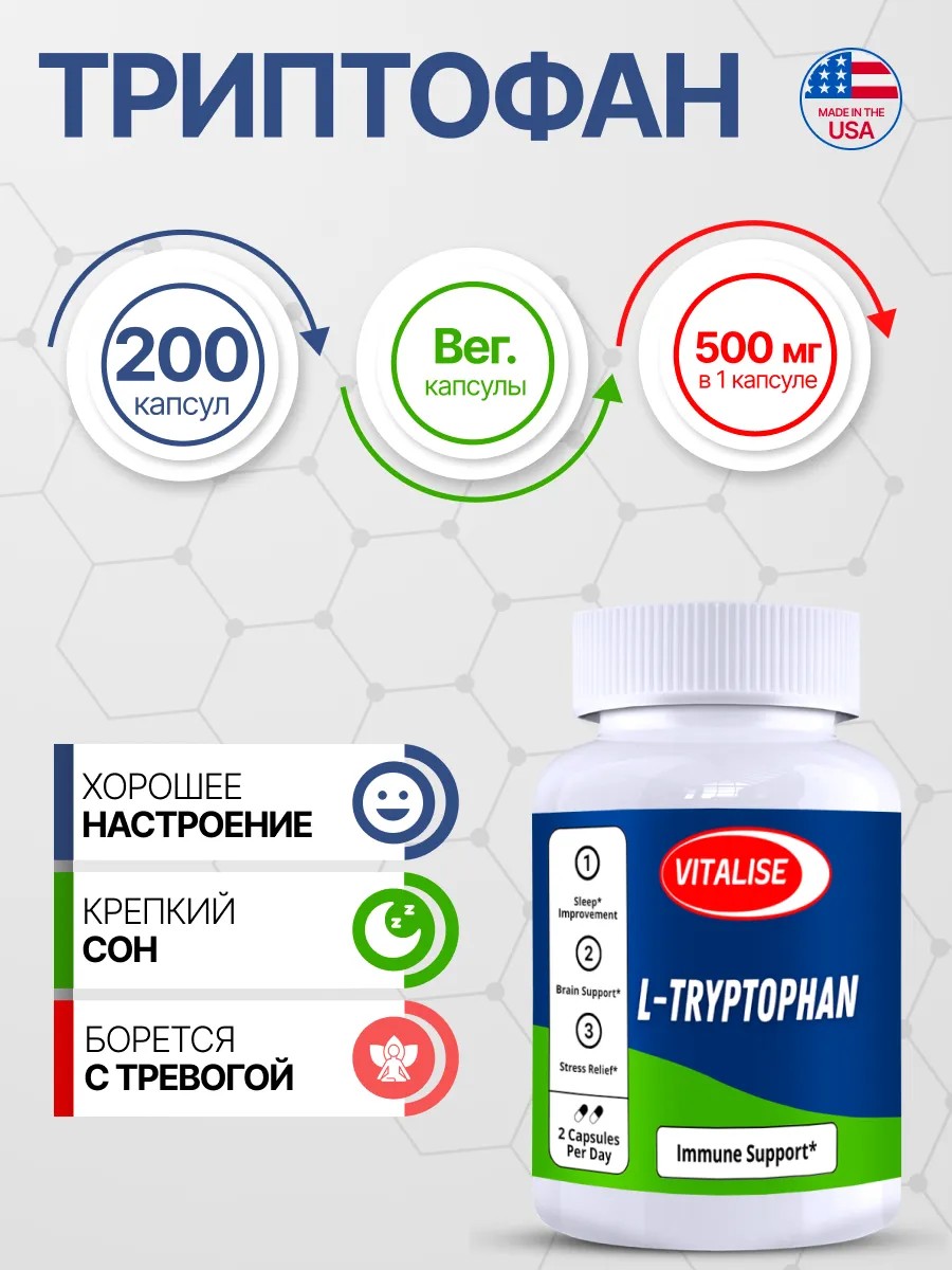 Поддержите своё эмоциональное и физическое здоровье с помощью триптофана! L Триптофан — это незаменимая аминокислота, которая способствует улучшению настроения, снижению стресса и поддержанию здорового сна. Он необходим для синтеза серотонина — гормона, который помогает бороться с депрессией, поддерживать эмоциональное равновесие и улучшать качество сна. Триптофан также обладает успокоительным эффектом, помогая снизить уровень тревожности и стресса.