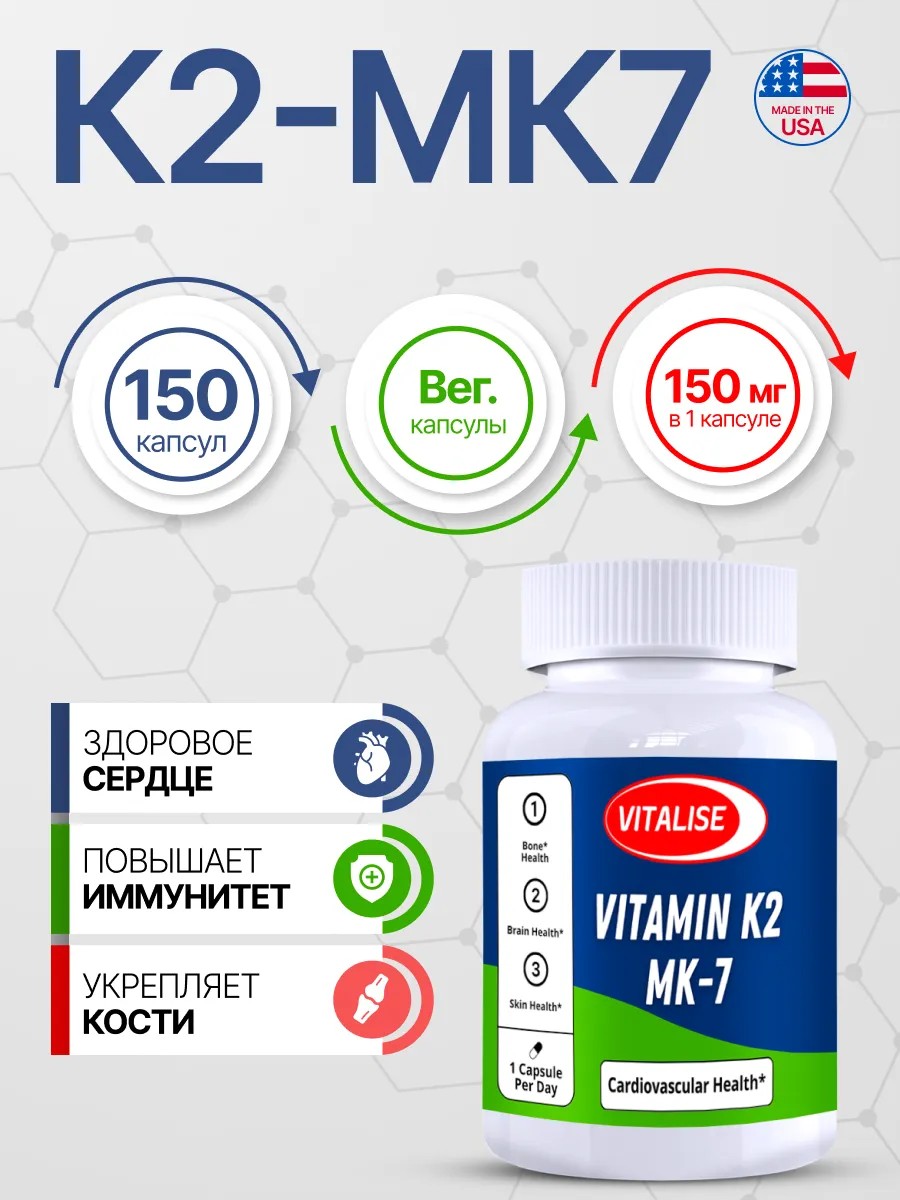 Витамин K2 MK-7 (также известный как менахинон-7) — жирорастворимое соединение из группы витаминов K, необходимое для поддержания нормального синтеза белков и эффективного метаболизма питательных веществ. Он помогает усваивать кальций и витамин D3, активирует остеокальцин — белок, повышающий минеральную плотность костей, что снижает риск остеопороза, переломов и травм. Витамин K2 улучшает состояние сердечно-сосудистой системы, поддерживая гибкость и эластичность артерий и предотвращая отложение кальция на их стенках, снижая риск кальциноза.
