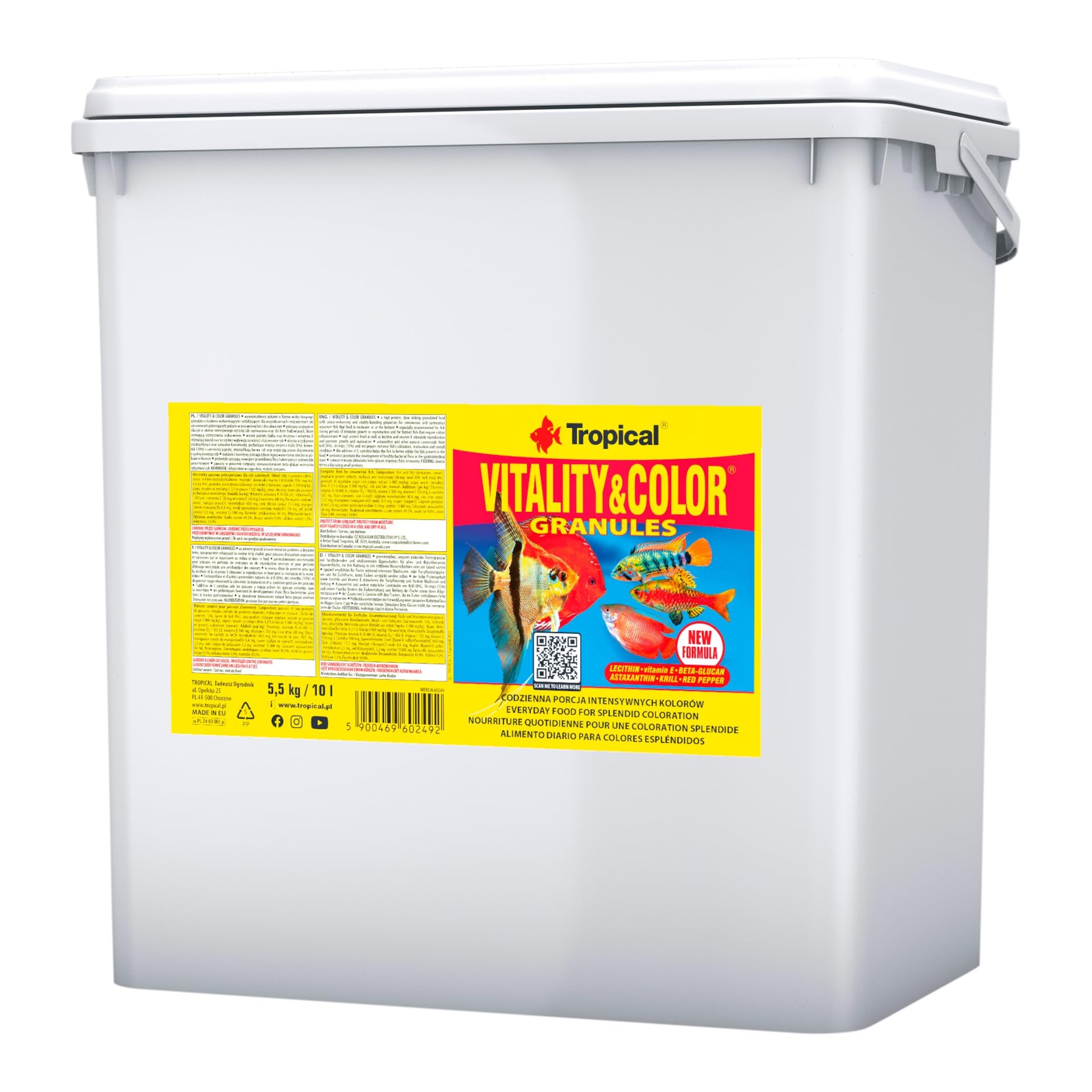 High protein, slow sinking pelleted food with color and vitality enhancing properties for omnivorous and carnivorous aquarium fish that feed in the middle of the water or on the bottom Particularly recommended for fish during periods of intensive growth or reproduction and for farmed fish that require color enhancement The high protein level as well as lecithin and vitamin e stimulate reproduction and promote growth and maturation Astaxanthin and other natural carotenoids from krill (8 ), shrimp (10 ) and red pepper improve coloring, maturation and general condition of fish The addition of l-carnitine helps fish better utilize fats present in food Prebiotics promote the development of healthy bacterial flora in the gastrointestinal tract Beta-glucan, a natural immune stimulator, improves fish immunity INGREDIENTS Complete food for ornamental fish. Composition: fish and fish derivatives, cereals, vegetable protein extracts, mollusks and crustaceans (shrimp meal 10 , krill meal 8 ), products of plant origin (red pepper extract 3,000 mg kg), algae, yeasts (including Beta-1,3 1,6-glucan 1,000 mg kg), oils and fats, minerals. Additives (per kg): Vitamins: vitamin A 30,000 IU, vitamin D3 1,900 IU, vitamin E 100 mg, vitamin C 550 mg, L-carnitine 500 mg. Trace elements: iron (iron(II) sulfate monohydrate) 40.0 mg, zinc (zinc oxide) 10.5 mg, manganese (manganese(II) oxide) 8.4 mg, copper (copper(II) sulfate pentahydrate) 2.0 mg, iodine (potassium iodide) 0.2 mg. Lecithin 15,000 mg. Colors: astaxanthin 84 mg. Antioxidants. Analytical constituents: crude protein 49.0 , crude fat 9.0 , crude fiber 3.0 , moisture 10.0 . DIRECTIONS FOR USE Store in a dry place close the bottle tightly after each use The optimal phosphorus content meets the needs of fish and limits algae growth. Beta-glucan, a natural immunostimulant, strengthens the fish's immune system. Prebiotics promote the development of healthy bacterial flora in the digestive system. High-protein granulated food with a color-enhancing and vitality-enhancing effect for omnivorous and carnivorous aquarium fish that feed in the pond or on the bottom. Nourriture granulée à haute teneur en protéines et à descente lente avec des propriétés rehaussant la couleur et la vitalité pour les poissons d'aquarium omnivores et carnivores qui se nourrissent au milieu de l'eau ou au fond Particulièrement recommandé pour les poissons pendant les périodes de croissance ou de reproduction intensive et pour les poissons d'élevage qui nécessitent une amélioration de la couleur Le niveau élevé de protéines ainsi que la lécithine et la vitamine e stimulent la reproduction et favorisent la croissance et la maturation L'astaxanthine et d'autres caroténoïdes naturels du krill (8 ), des crevettes (10 ) et du poivron rouge améliorent la coloration, la maturation et l'état général du poisson L'ajout de l-carnitine aide les poissons à mieux utiliser les graisses présentes dans les aliments Les prébiotiques favorisent le développement d'une flore bactérienne saine dans le tractus gastro-intestinal Le bêta-glucane, un stimulateur immunitaire naturel, améliore l'immunité des poissons INGRÉDIENTS Aliment complet pour poissons d'ornement. Composition : poissons et dérivés de poissons, céréales, extraits de protéines végétales, mollusques et crustacés (farine de crevettes 10 , farine de krill 8 ), produits d'origine végétale (extrait de piment rouge 3 000 mg kg), algues, levures (dont Beta- 1,3 1,6-glucane 1 000 mg kg), huiles et graisses, minéraux. Additifs (par kg) : Vitamines : vitamine A 30 000 UI, vitamine D3 1 900 UI, vitamine E 100 mg, vitamine C 550 mg, L-carnitine 500 mg. Oligo-éléments : fer (sulfate de fer(II) monohydraté) 40,0 mg, zinc (oxyde de zinc) 10,5 mg, manganèse (oxyde de manganèse(II)) 8,4 mg, cuivre (sulfate de cuivre(II) pentahydraté) 2,0 mg, iode (iodure de potassium ) 0,2 mg. Lécithine 15 000 mg. Colorants : astaxanthine 84 mg. Antioxydants. Constituants analytiques : protéines brutes 49,0 , matières grasses brutes 9,0 , fibres brutes 3,0 , humidité 10,0 . MODE D'EMPLOI Entreposer dans un endroit sec bien refermer le bidon après chaque utilisation La teneur optimale en phosphore répond aux besoins des poissons et limite la prolifération des algues. Le bêta-glucan, immunostimulant naturel, renforce le système immunitaire des poissons. Les prébiotiques favorisent le développement d'une flore bactérienne saine dans l'appareil digestif. Aliment granulé à haute teneur en protéines ayant un effet de rehaussement de la couleur et de la vitalité pour les poissons d'aquarium omnivores et carnivores qui se nourrissent dans l'étang ou au fond de l'eau.