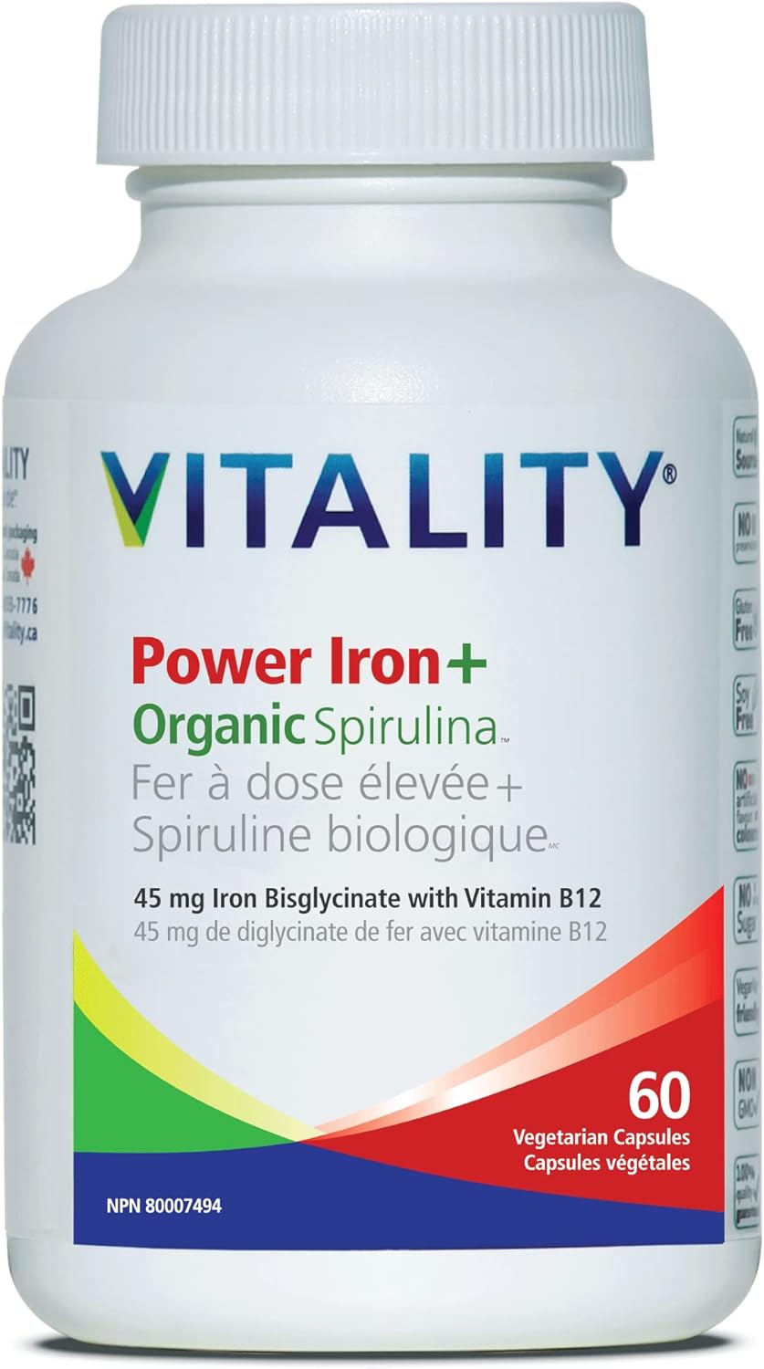 Size: 60 Tablets VITALITY Power Iron + Organic Spirulina is the best iron supplement to treat iron deficiency, anemia and deliver oxygen and power your body. VITALITY Power Iron + Organic Spirulina contains iron bisglycinate which is gentle on the stomach, well absorbed and non-constipating. Each iron capsule contains certified Organic Spirulina powder which naturally boosts energy and has been proven to enhance iron absorption. VITALITY Power Iron + Organic Spirulina helps combat fatigue and exhaustion caused by low iron, so you feel energetic with increased stamina and endurance. VITALITY Power Iron + Organic Spirulina is vegan friendly, gluten free, non-GMO, soy free, sugar free, and contain no artificial colors, fillers or preservatives. This supplement is tested to guarantee quality, potency and purity. Made in Canada and tested to guarantee quality, potency and purity.
