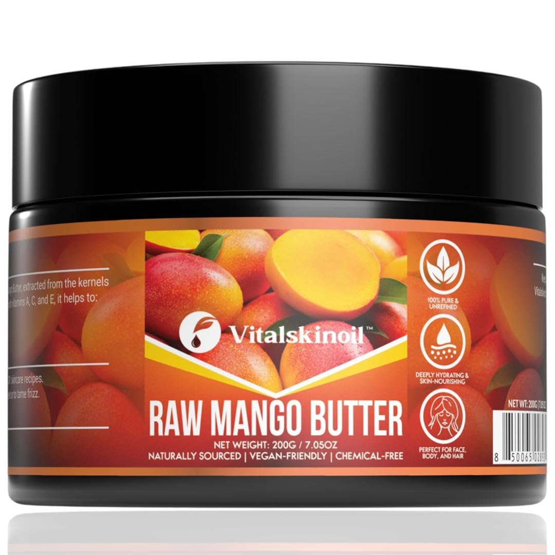 GENEROUS SIZE: 7.05 oz (200g) jar of premium raw mango butter for long-lasting skincare benefits. VEGAN FORMULA: Plant-based butter that's naturally sourced and organic, perfect for conscious skincare routines. RICH TEXTURE: Creamy, smooth consistency that melts easily on contact with skin for better absorption and application. VERSATILE USE: Multi-purpose butter suitable for face, body, and hair care applications, offering deep moisturizing benefits. PURE NATURAL: Our cold pressed raw mango butter extracted from mango kernels, 100 pure and unrefined without any added chemicals or preservatives.