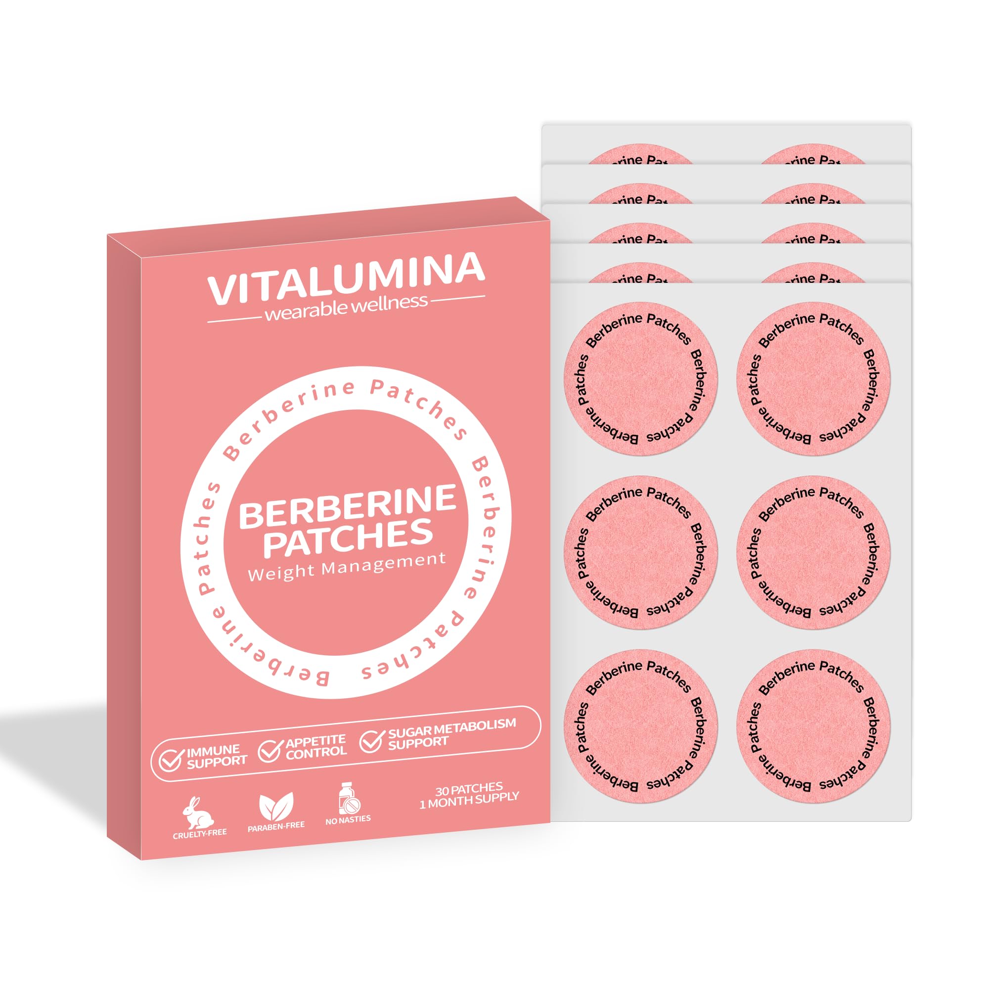 Vitalumina Berberine Patches deliver a convenient, plant-based solution for daily wellness. Each patch is infused with Berberine, Pomegranate, Cinnamon, and L-Glutamine, carefully selected to support healthy metabolic function and maintain balanced energy levels throughout the day. Ideal for adults seeking a simple, natural addition to their daily routine, these patches are easy to use, discreet, and vegan-friendly. Apply a patch to a clean, dry area for gentle, continuous support. With 30 patches per pack, you'll enjoy a full month of plant-based wellness without the need for pills or powders. Clean, simple, and effective, Vitalumina Berberine Patches fit seamlessly into your busy lifestyle.Long-Lasting Support With continuous support throughout the day, these patches offer a simple and reliable addition to your daily wellness habits. Clean, Vegan-Friendly Ingredients Our vegan formula is free from artificial additives and preservatives, providing a natural, plant-based option for daily wellness. Convenient Discreet Application Each patch is easy to apply and discreet, making it simple to integrate into your daily routine at home, work, or on the go. Supports Healthy Metabolic Function Designed to provide gentle, daily support for balanced metabolic function and steady energy levels throughout your day. Plant-Based Daily Wellness Formulated with Berberine, Pomegranate, Cinnamon, and L-Glutamine, these patches offer a convenient, plant-based way to support your overall wellness routine.