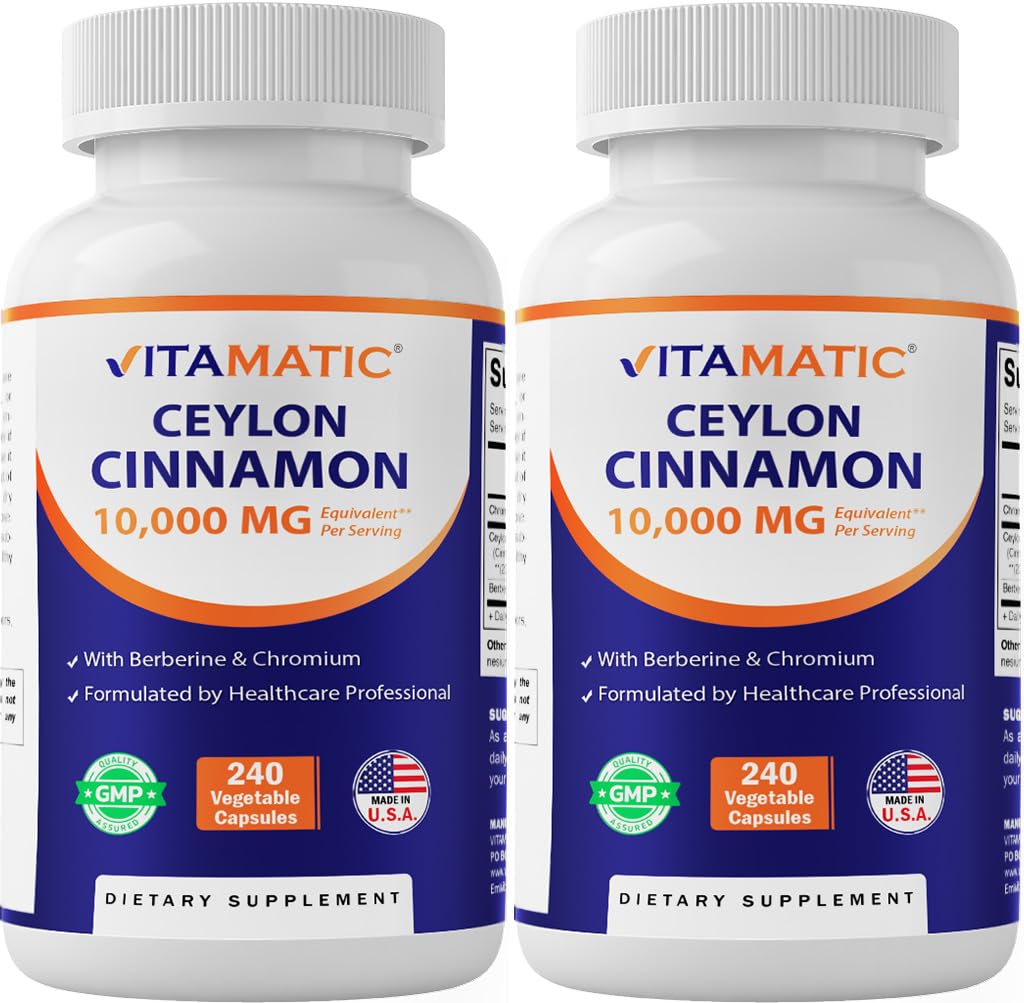 Vitamatic Ceylon Cinnamon 10000 mg Equivalent Per Serving (from 20:1 Extract 500 mg) with Berberine & Chromium - 240 Vegetable Capsules - Non-GMO & Gluten Free-2 Pack