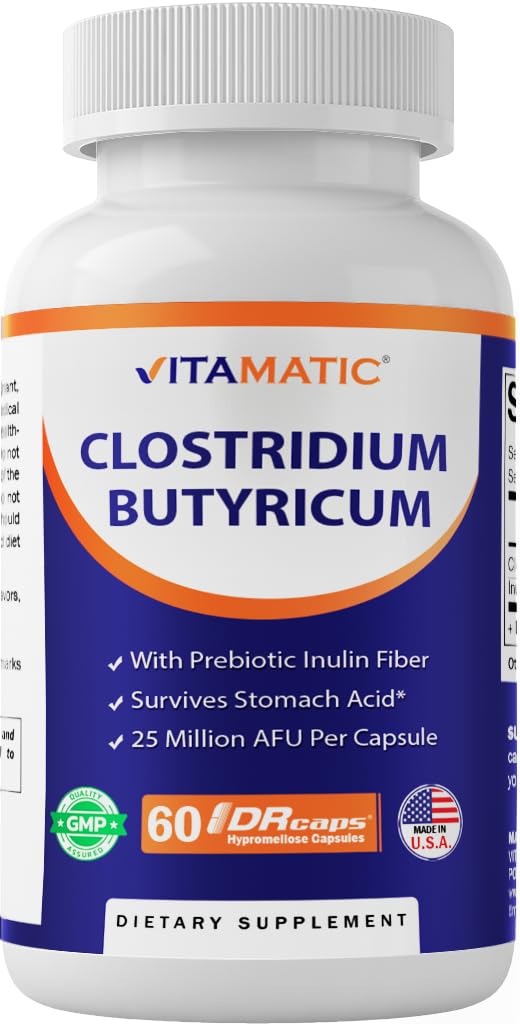 Vitamatic Clostridium butyricum 25 Million - Gut Health - 60 DR Capsules (Delayed Released) - Made with Prebiotic Inulin Fiber