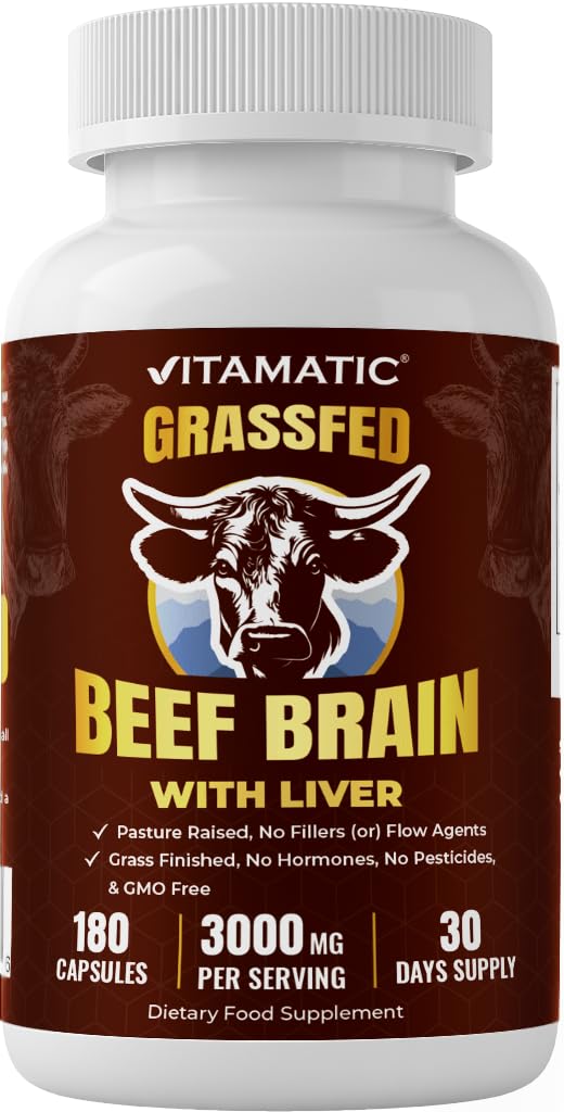 Vitamatic Grass-Fed Beef Brain with Liver 180 Capsules Freeze-Dried, Non-GMO, Bovine Liver Supplement Pasture-Raised, Glandular-Based Formula Brain 180 Count (Pack of 1)