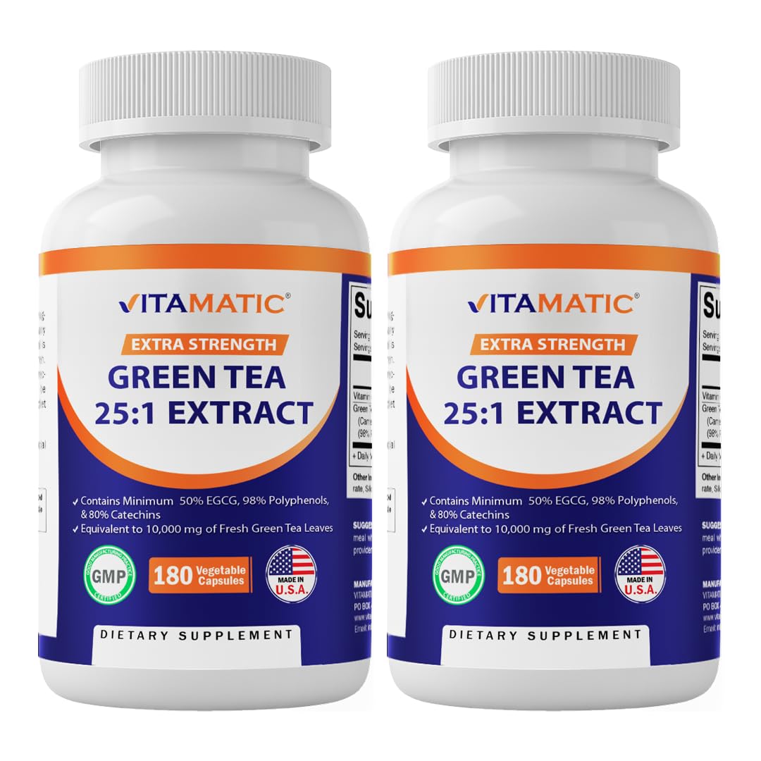 Made in the USA with Strict GMP standards. Potent Dosage: Each capsule provides a highly concentrated dose of green tea extract and vitamin C. Easy to Consume: Convenient capsule form, allowing for easy and consistent daily intake. Vegan-Friendly: Encapsulated in 180 vegetarian capsules, making it suitable for vegan and vegetarian diets. Antioxidant Boost: Contains vitamin C, a powerful antioxidant that supports overall health and well-being. Concentrated Formula: 25X concentrated green tea extract, delivering 98 polyphenols, 80 catechins, and 50 EGCG.