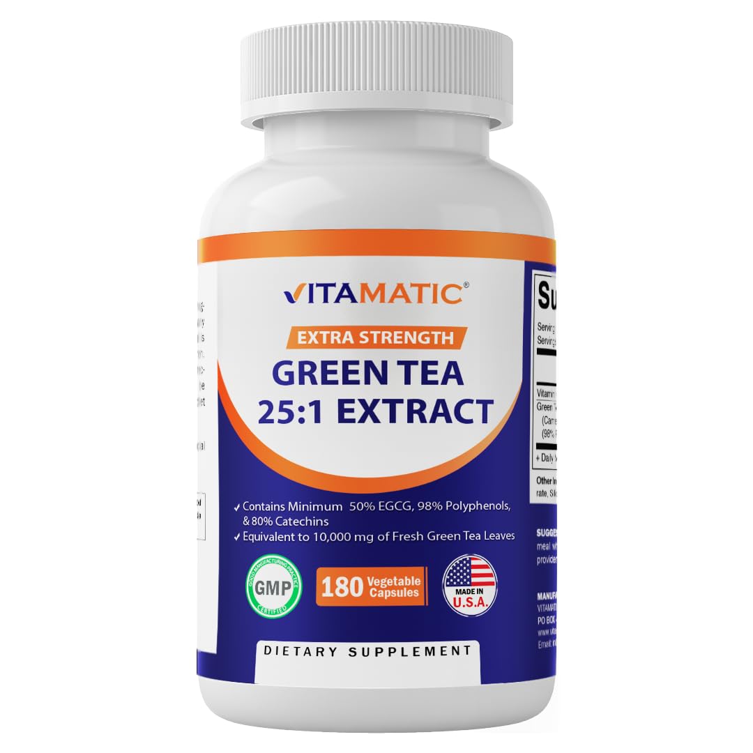 Made in the USA with Strict GMP standards. Potent Dosage: Each capsule provides a highly concentrated dose of green tea extract and vitamin C. Easy to Consume: Convenient capsule form, allowing for easy and consistent daily intake. Vegan-Friendly: Encapsulated in 180 vegetarian capsules, making it suitable for vegan and vegetarian diets. Antioxidant Boost: Contains vitamin C, a powerful antioxidant that supports overall health and well-being. Concentrated Formula: 25X concentrated green tea extract, delivering 98 polyphenols, 80 catechins, and 50 EGCG.
