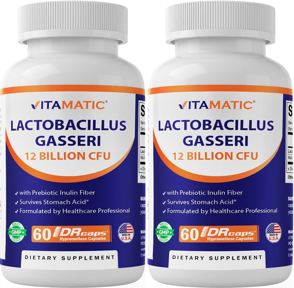 Vitamatic Lactobacillus Gasseri - 12 Billion per DR Capsule - 60 Count - Digestive Support - Made with Prebiotic Inulin Fiber- 2 Pack