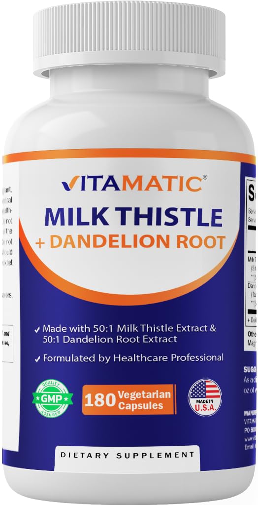Vitamatic Milk Thistle 50:1 Extract 500mg, Dandelion Root 50:1 Extract 100mg, 180 Vegetarian Capsules, Non-GMO, Gluten Free