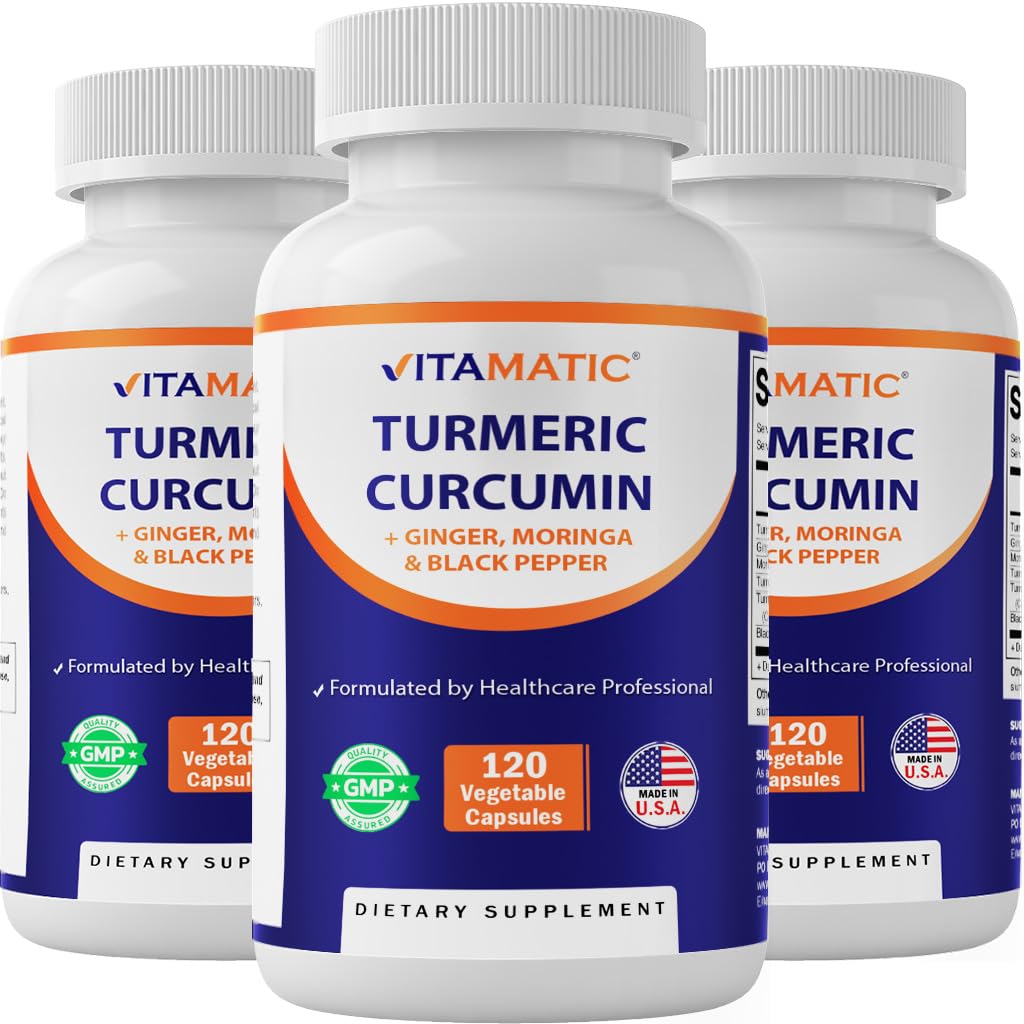 Vitamatic Turmeric Curcumin Supplement (10:1 Equivalent 3000 Per Serving, Made with 95% Curcuminoids, Black Pepper, Ginger, Moringa) 120 Vegetable Capsules, Non-GMO, Gluten Free - 3 Pack