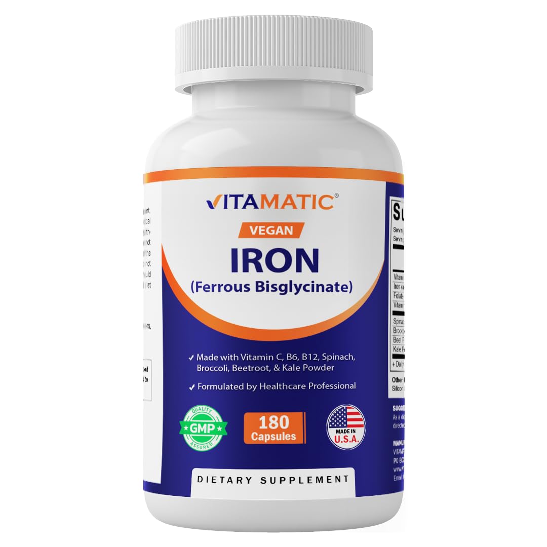 Vitamatic Vegan Iron with Vitamin C B6 B12 & Folic Acid | Plus Spinach Broccoli Beetroot & Kale | 180 Capsules | Non-GMO Gluten-Free Sugar-Free | Made in USA