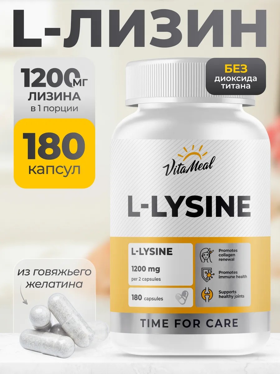 Lysine from VitaMeal are capsules containing the amino acid L-lysine. Lysine is an essential amino acid that our body does not produce on its own and can only be obtained from food or dietary supplements. Lysine 1000 mg is a component of hormones, enzymes, and important proteins such as collagen, which is necessary for skin elasticity and regeneration, as well as joint and ligament flexibility. Lysine also plays a key role in healthy calcium absorption and the prevention of calcium-related diseases, such as osteoporosis. Lysine 1200 mg also helps strengthen the immune system and produce protective antibodies, as well as synthesize important proteins, hormones, and enzymes. A lysine deficiency of 500 mg can negatively impact immunity, skin and joint health and elasticity, as well as overall well-being, energy, and appetite. To prevent lysine deficiency and promptly compensate for its deficiency, we recommend taking the dietary supplement L-lysine from VitaMeal. Take 1 to 3 lysine capsules daily to support collagen production and boost your immune system for a healthy, active life at any age. Try our products today and feel better than ever!