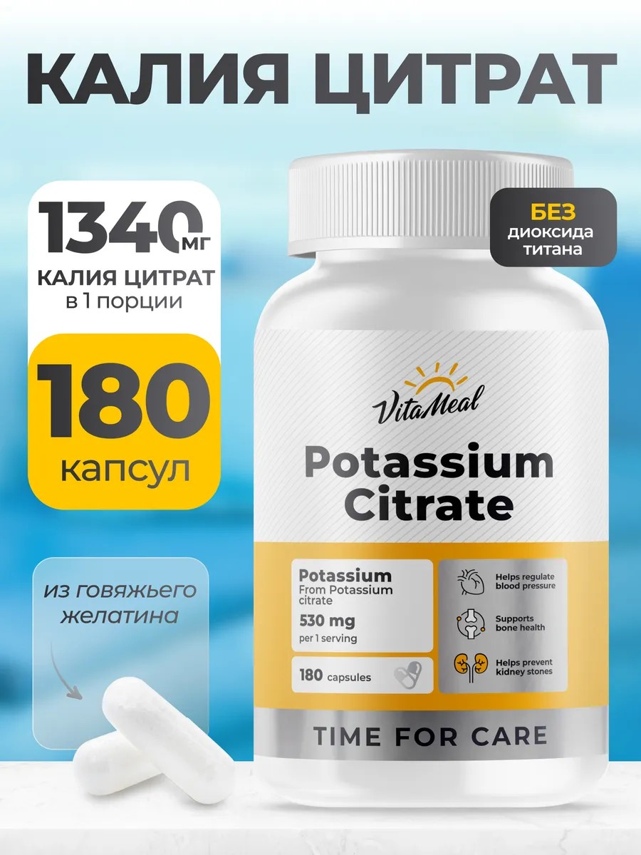Калия цитрат от VitaMeal - это источник калия в форме калия цитрата в капсулах для приема внутрь.