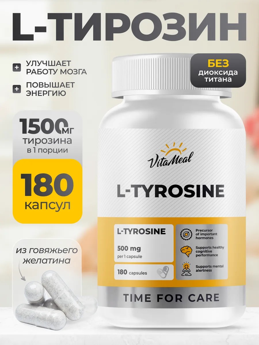 Тирозин от VitaMeal - это источник аминокислоты l тирозин в капсулах. л тирозин 1000мг - аминокислота, из которой образуются гормоны щитовидной железы и надпочечников (Т3, Т4, катехоламины). Эти гормоны регулируют деятельность нервной системы, мозга, рост и развитие новых клеток, способность организма адаптироваться ко всем нагрузкам и стрессам. Недостаток тирозина и фенилаланина (аминокислоты, из которой в организме образуется тирозин) может спровоцировать: депрессивное состояние, сильную восприимчивость к стрессам, ухудшение мыслительных функций, логики, пространственного и творческого мышления, слабость, утомляемость, нарушения в эндокринной системе. l-тирозин в капсулах, является эффективным средством в сфере спортивного питания, для снижения и контроля веса и похудения, жиросжигателем и детоксом, против аппетита. l тирозин важный компонент для похудения, он поддерживает здоровье гормональной системы и мозга.