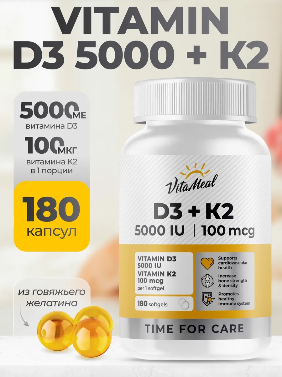 Витамин д3+ к2 от VitaMeal - это источник витамина D3 в форме холекальциферола и витамина K2 в форме МК-7 (менахинона-7) в мягких гелевых капсулах.