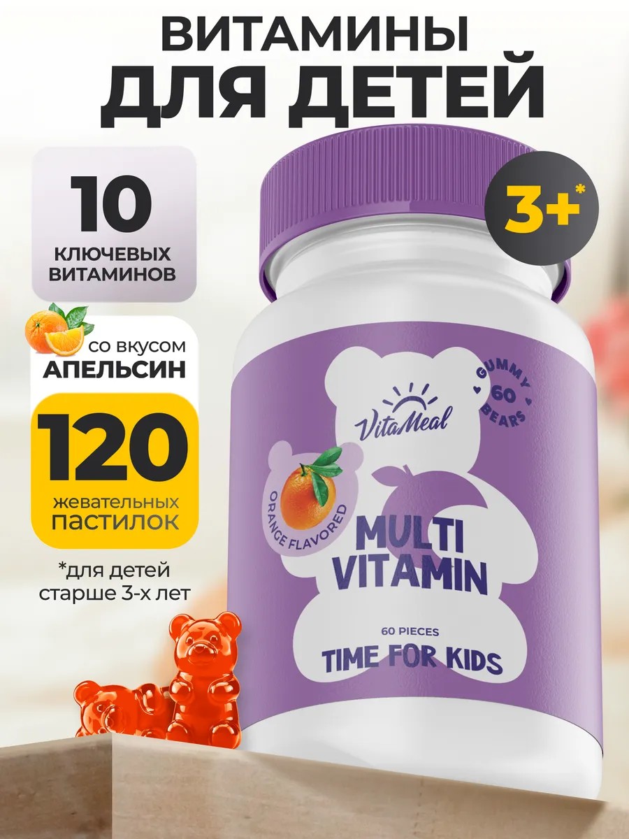 Мультивитамины для детей от VitaMeal - это комплексный источник витаминов для детей от 3 лет, мультивитамины в форме жевательных пастилок-медвежат с натуральным апельсиновым вкусом.