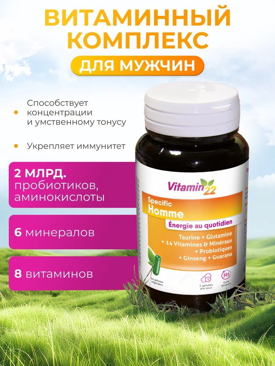 Vitamin complex for men. A unique combination of lactic acid enzymes (2 billion Lactobacillus rhamnosus, lactobacillus acidophilus), 8 vitamins (A, C, E, B1, B2, B3, B5, B8), 6 minerals (potassium, copper, chromium, zinc, selenium, molybdenum), plant extracts (guarana), amino acids (taurine & glutamine). VITAMIN'22 For Men is specially designed to provide the male body with essential nutrients: vitamins C, B2, B3 and B5 reduce fatigue; vitamins C, B1, B2, B3 and copper are involved in energy metabolism; vitamin C, copper, melene and zinc support the immune system. INN/Active ingredient. An additional source of vitamins B1, B2, B3 (niacin), B5 (pantothenic acid). Dosage: 2 capsules per day. Directions: Adults take 2 capsules in the morning with meals. Recommended dosage: 2-3 weeks. Shelf life: 36 months. Store in a dry, dark place, out of reach of children, at a temperature not exceeding 25°C. Contraindications: Individual intolerance to any of the ingredients, pregnancy, breastfeeding, increased nervous excitability, insomnia, high blood pressure, irregular heartbeat, severe atherosclerosis. Consult a physician before use. Indications: ESPECIALLY FOR MEN! STRENGTHENING AND ANTI-FATIGUE EFFECT! 502 mg capsules.