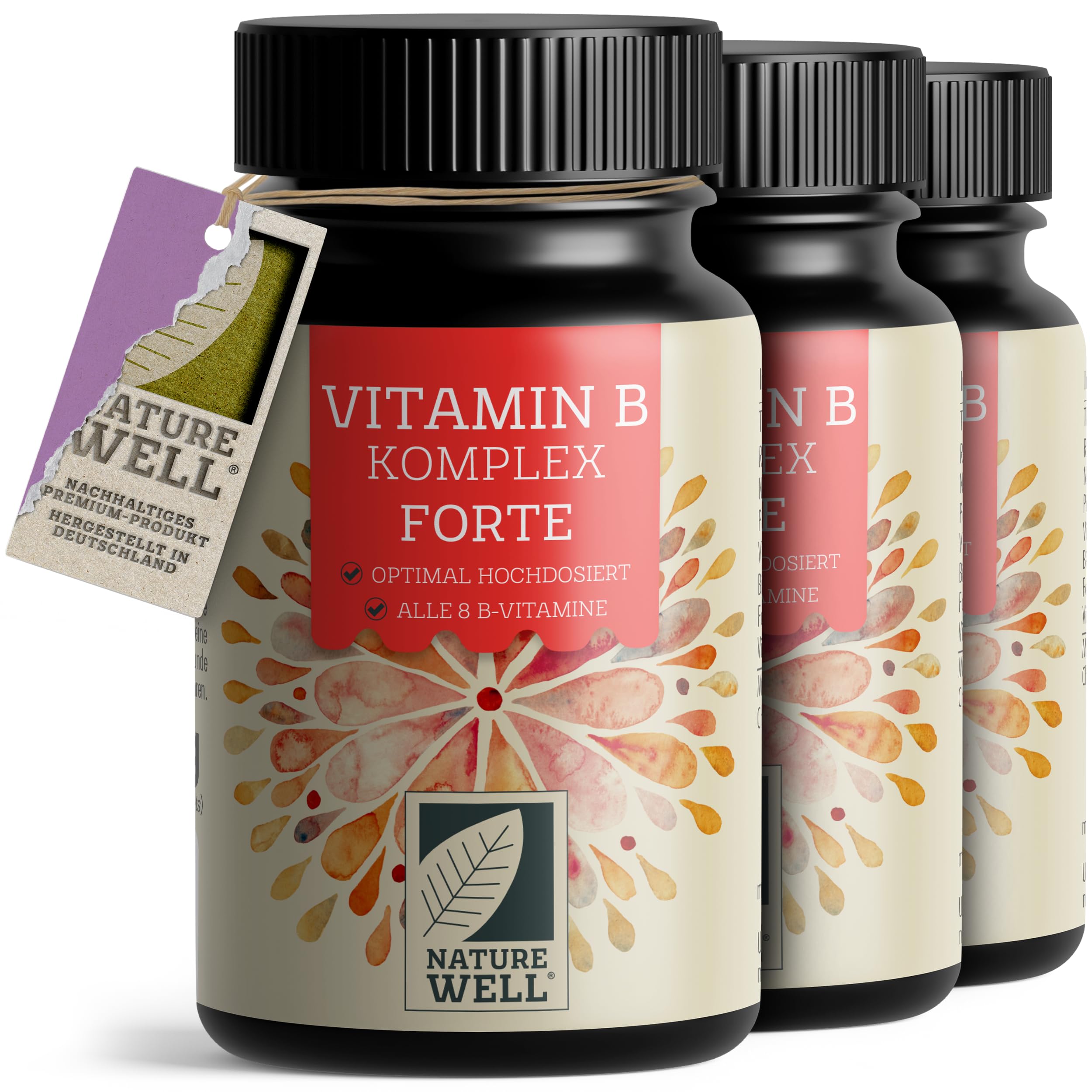 HERGESTELLT IN DEUTSCHLAND: Die Produktion des NatureWell Vitamin B Komplex Forte findet ausschließlich in Deutschland statt und unterliegt somit den strengen deutschen Qualitätsrichtlinien. VEGAN OHNE UNERWÜNSCHTE ZUSATZSTOFFE: Der Vitamin B Komplex Forte enthält ausschließlich Inhaltsstoffe aus nicht-tierischer Herkunft. Die Vitamin B-Tabletten sind frei von unerwünschten Zusätzen wie z.B. Magnesiumsalze der Speisefettsäuren (Magnesiumstearat) oder Siliciumdioxid. HOCHDOSIERT BIOAKTIV: Alle B-Vitamine in dem Komplex sind entsprechend hochdosiert und decken neben dem Grundbedarf auch einen eventuellen Mehrbedarf ideal ab. Die B-Vitamine liegen hierbei in Aktiv-Formen vor - das heißt, der Körper kann diese ohne Umwandlung direkt verwerten: Quatrefolic Folsäure (B9), Riboflavin-5'-Phosphat (B2), Pyridoxal-5'-Phosphat (B6) oder die bioaktiven B12-Formen Methylcobalamin und Adenosylcobalamin. ✓ VITAMIN B KOMPLEX FORTE: Die B-Vitamin-Tabletten von NatureWell enthalten alle 8 essentiellen B-Vitamine (B1, B2, B3, B5, B6, B7, B9, B12) in Kombination mit den zwei Co-Faktoren Myo-Inositol und Cholin und gewährleisten somit eine optimale Versorgung mit dem gesamtem B-Vitamin-Spektrum. 3ER-PACK: Der 3er-Pack enthält 3 Dosen NatureWell VITAMIN B Komplex FORTE mit jeweils 180 Tabletten 540 Tabletten insgesamt. Bei täglicher Einnahme reicht der 3er-Pack somit für volle 18 Monate bzw. dient als Vorrat für die ganze Familie.