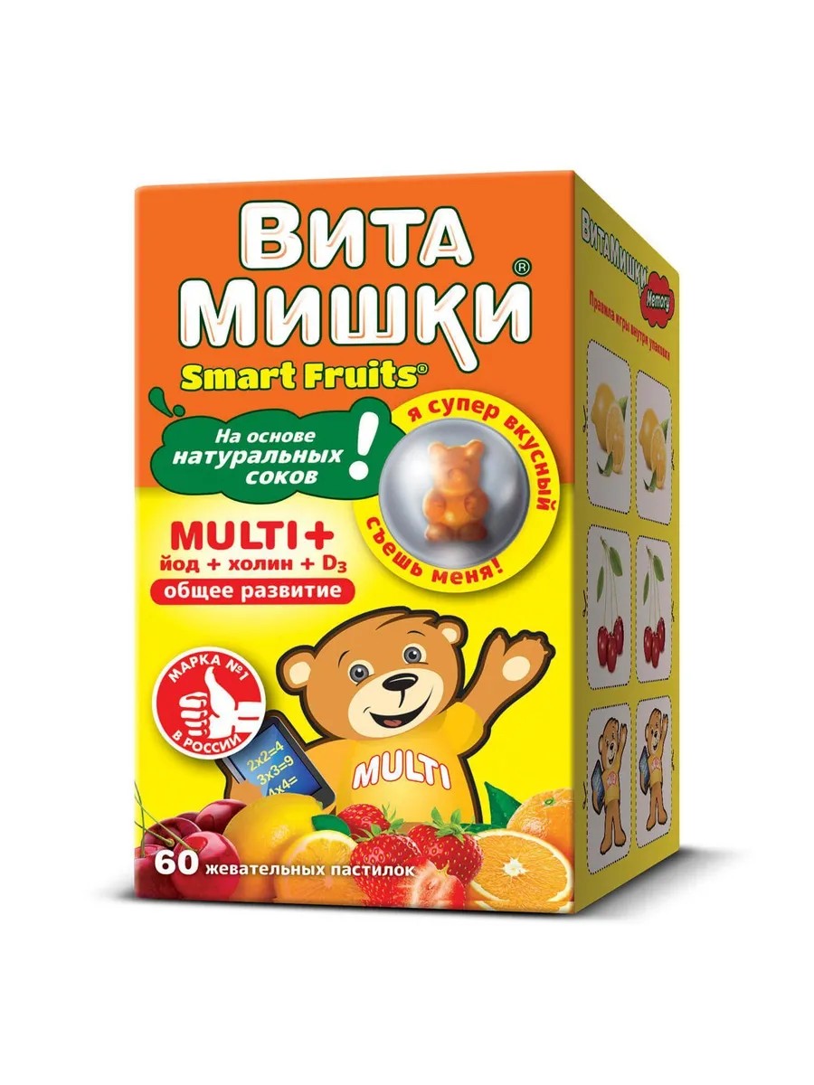 Витамины для детей ВитаМишки Smart Fruits МУЛЬТИ + йод + холин 60. Мультивитамины с йодом + Цинк + витамин Д + витамин C Витамин Д3 для детей. ВитаМишки представляют собой уникальный тщательно сбалансированный комплекс витаминов и микроэлементов, необходимых детям, выполненный в форме жевательных мармеладных пастилок. Пастилки имеют форму мишек четырех разных вкусов: клубника, лимон, апельсин и вишня. Прием ВитаМишек обеспечивает ребенку здоровье, умственную и физическую активность, способствует профилактике простудных и других заболеваний. Удобны для детей, которые не любят жевательные таблетки.