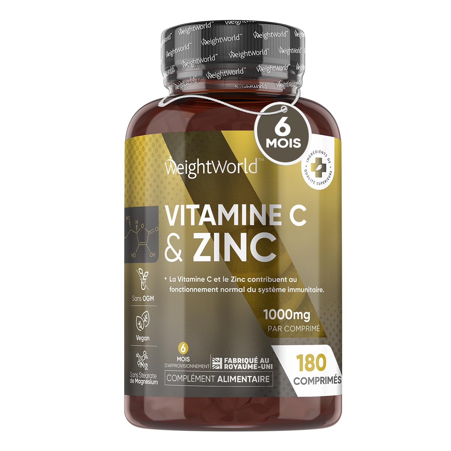 TRUSTED BRAND, WEIGHTWORLD - Our British family business has been creating nutritional supplements for your well-being since 2006. Treat yourself to the best with our impeccable quality products and devices. All of our products meet your specific needs!. VEGAN, GLUTEN FREE - Our highly absorbable Vitamin C 1000mg (Ascorbic Acid) breakable tablets are formulated with naturally sourced and premium ingredients. They are sugar-free, easy to swallow, vegan, keto, gluten-free and non-GMO. Enjoy our 180 tablets at a dose of 1 tablet per day for 6 months. Keep your daily vitality alive. FEEL THE DIFFERENCE WITH ZINC BISGLYCINATE - Zinc Bisglycinate facilitates the absorption of vitamin C in the body. In addition, zinc contributes to the maintenance of normal vision, fertility and also to the maintenance of normal testosterone levels in the blood (EFSA). Boost your immunity with Vitamin C and Zinc Bisglycinate!. POWERFUL ANTIOXIDANT - Vitamin C and Zinc are essential antioxidants that help protect cells from oxidative stress. Vit C improves iron absorption. In addition, it is crucial for maintaining optimal functioning of the nervous system, thus contributing to the reduction of tiredness and fatigue (EFSA). Get protection with our tablets!. GLOW FROM WITHIN WITH OUR VITAMIN C ZINC - The combination of Vitamin C and Zinc is often used to improve overall health. Vitamin C with Zinc Bisglycinate contributes to the normal function of the immune system, normal collagen formation for the normal function of bones, teeth and skin. (EFSA).MARQUE DE CONFIANCE, WEIGHTWORLD - Notre entreprise familiale britannique est dans la création de compléments alimentaires pour votre bien-être depuis 2006. Offrez-vous le meilleur avec nos produits et nos appareils de qualité irréprochable. Tous de nos produits répondent à vos besoins spécifiques !. VEGAN, SANS GLUTEN - Nos comprimés cassables de Vitamine C 1000mg (Acide Ascorbique) hautement absorbables sont formulés avec des ingrédients d'origine naturelle et de qualité supérieure. Ils sont sans sucre, faciles à avaler, vegan, keto, sans gluten et sans OGM. Profitez de nos 180 comprimés à raison d'1 comprimé par jour durant 6 mois. Gardez vitalité votre quotidienne. RESSENTEZ LA DIFFÉRENCE AVEC ZINC BISGLYCINATE - Le Bisglycinate de Zinc facilite l'absorption de la vitamine C dans le corps. De plus, le zinc contribue au maintien d'une vision, d'une fertilité normale et aussi au maintien du taux de testostérone dans le sang (EFSA). Renforcez votre immunité avec la vitamine C et le zinc bisglycinate !. ANTIOXYDANT PUISSANT - La vitamine C et le Zinc sont des antioxydants essentiels qui aident à protéger les cellules contre le stress oxydatif. La vit C améliore l'absorption du fer. De plus, elle est cruciale pour maintenir le fonctionnement optimal du système nerveux, contribuant ainsi à la réduction de la fatigue (EFSA). Bénéficiez d'une protection avec nos comprimés !. RAYONNEZ DE L'INTÉRIEUR AVEC NOTRE VITAMINE C ZINC - La combinaison de la vitamine C et du zinc est souvent utilisée pour améliorer la santé globale. La vitamine C avec zinc bisglycinate contribue au fonctionnement normal du système immunitaire, à la formation normale de collagène pour le fonctionnement normal des os, des dents et de la peau. (EFSA).